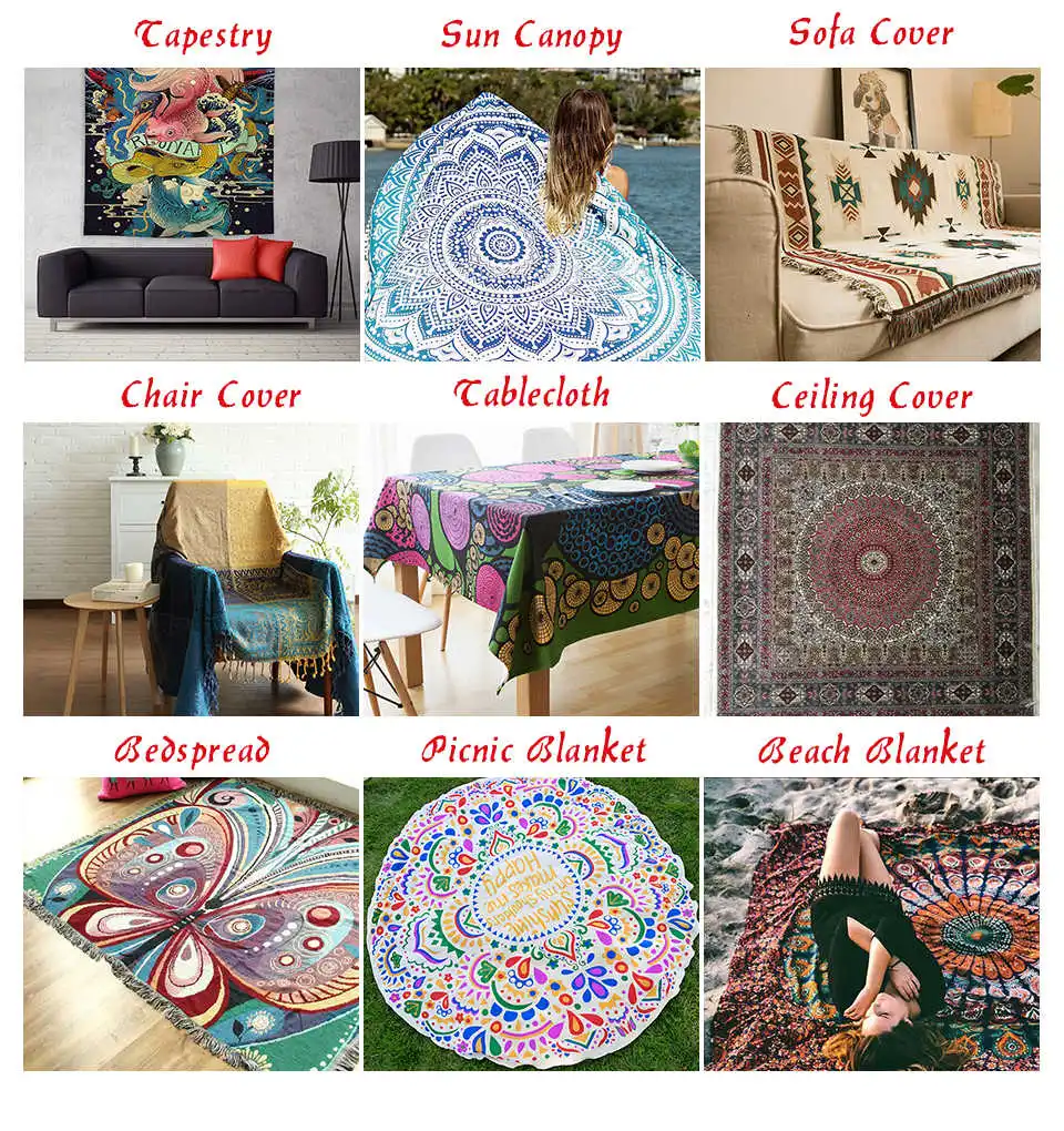 Использование: гобелен, пляжное полотенце, учетная запись кровати, наборы диванов, скатерть, простыни, потолок, коврики Piclinc