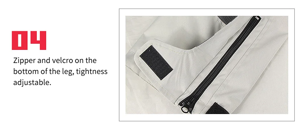Характеристики продукта: 1. Липучка на талии, размер талии регулируется. 2. Боковой карман удобен для размещения предметов. 3. Съемный наколенник может защитить колени во время езды. 4. Легкие штаны и свободный дизайн, удобные во время езды. 5. Ноги на молнии с липучкой легко носить и снимать. 6. Икры и талия на липучке для удобной регулировки плотности. * 7. Летние брюки со съемной водонепроницаемой подкладкой. * 8. Зимние брюки изготовлены из водонепроницаемой подкладки и со съемной термоподкладкой.