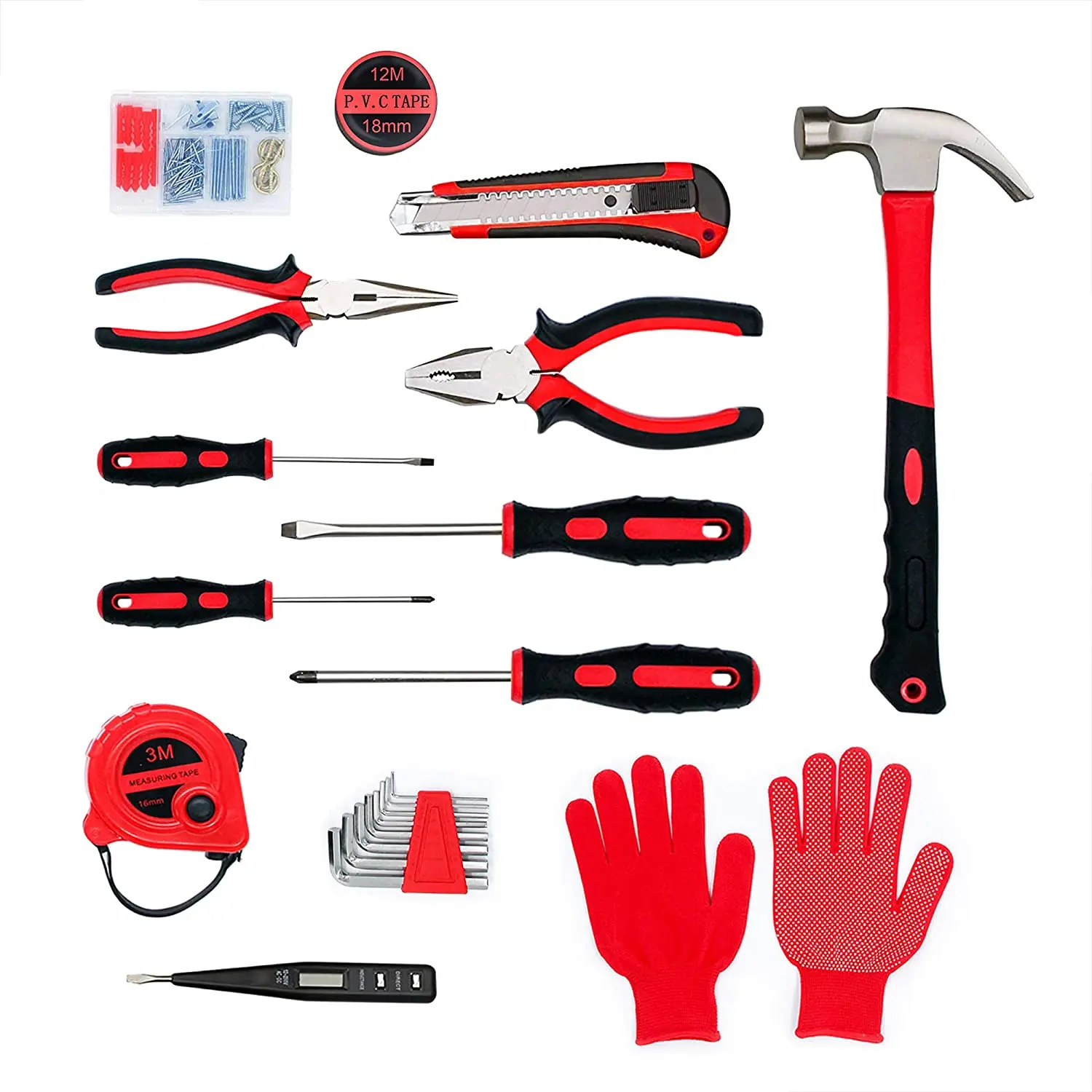 Домашний набор инструментов для дома Наши наборы инструментов включают в себя отвертки, нож, рулетку, тестер напряжения, шестигранный ключ (2-6 мм),8 унций молоток, плоскогубцы, изоляционную ленту, перчатки, ассортимент комплекта, перчатки, BOLTHO ящик для инструментов, содержит все самые полезные и необходимые инструменты для домашнего обслуживания и ежедневного использования