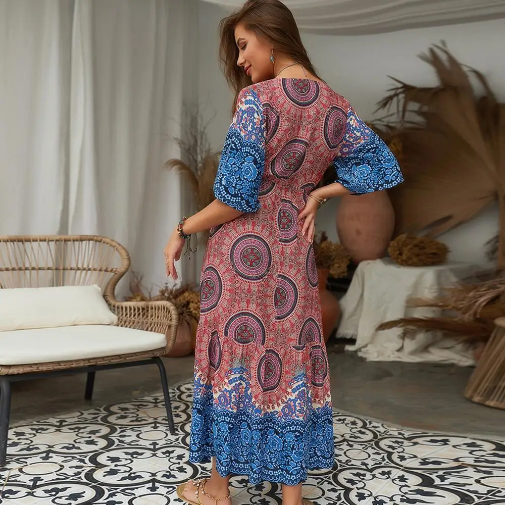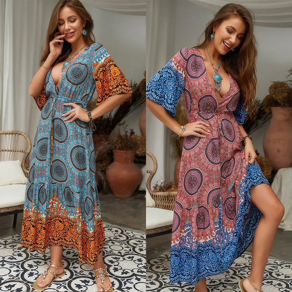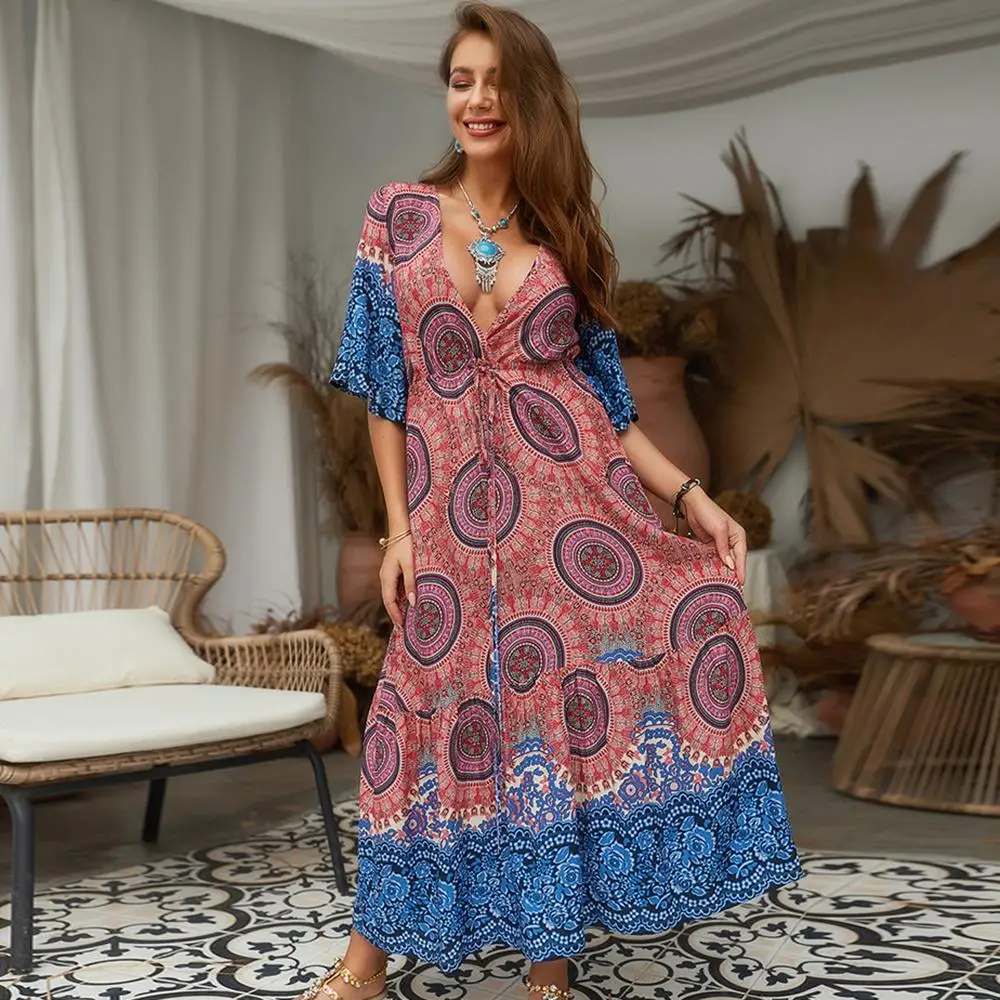* Описание товара: Для женщин Летнее сексуальное нижнее белье с глубоким v-образным вырезом в стиле «Бохо в цветах с коротким рукавом пляжные Модное Длинное Платье