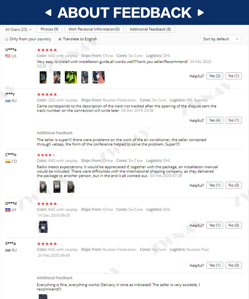 1. Таможенные пошлины и налоги являются обязанностью покупателей, мы, продавец не можем контролировать их и не будем нести за это ответственность, пожалуйста, обратите внимание на это, прежде чем разместить заказ. Если товар был возвращен из-за опровержения покупателя, чтобы очистить таможню или получить посылку, Доставка почтовых отправлений и дорогой сбор за возврат будут падать на ответственность покупателей. 2. Если ваш адрес доставки относится к удаленной области в системе доставки транспортной компании, вам необходимо добавить удаленную плату за доставку посылки или изменить более Сельский адрес доставки, В противном случае ваша посылка не может быть отправлена. Независимо от того, принадлежит ли ваш адрес удаленной области или нет, вы можете проверить свой адрес на DHL веб-сайте. 3. Пожалуйста, не поставляйте почтовый адрес, мы не можем отправить посылку на этот адрес. Примечание: российские клиенты должны указать свое полное имя для контактного имени на посылке