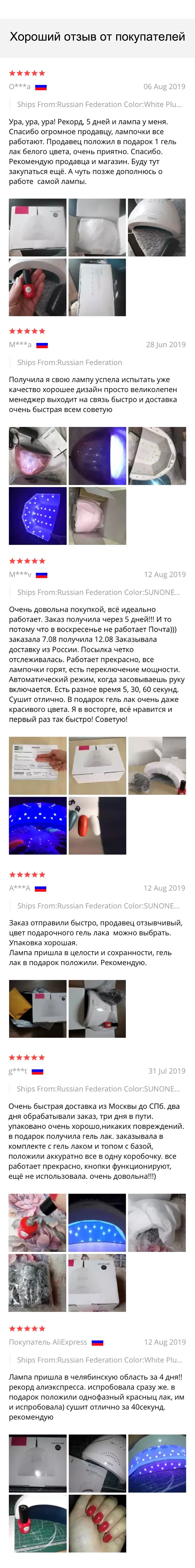 Почему стоит выбрать светодиодную лампу для ногтей серии SUN? Источник белого света Защитите вашу кожу от почернения. По сравнению с традиционным ультрафиолетовым светом, наш белый светодиод предлагает комфортный маникюр / педикюр и защиту ваших ногтей, кожи и глаз. Вылечить все виды гель лака для ногтей. Эта УФ / светодиодная лампа для ногтей подходит для отверждения всех видов гелевых лаков, включая УФ-клей для ногтей, строительный гель, гель для скульптуры ногтей, драгоценный клей и светодиодный гель для ногтей. Автоматический датчик разработан. Он имеет интеллектуальный датчик и включается автоматически, когда вы скользите рукой / ногой, и выключается, когда вы скользите. или вы можете прекратить лечение в любое время, выдвинув руку / ногу. 99s Low Heat Mode разработан для лучшего отверждения твердого геля / строителя. Быстрое отверждение. Это низкая мощность, но быстрая сушка, которая может сократить время отверждения на 50% или перегреть, чем другие сушилки. Быстро и тихо, не нужно никаких поклонников! Прочные светодиодные фонари. 30 прочных светодиодных бусин со сроком службы 50000 часов без перерыва, срок службы до 5 лет непрерывного использования. Не нужно беспокоиться о замене световых бус. Быстросохнущая мощность 48 Вт, которая может сократить время отверждения на 50% или перегреть по сравнению с другими сушилками.