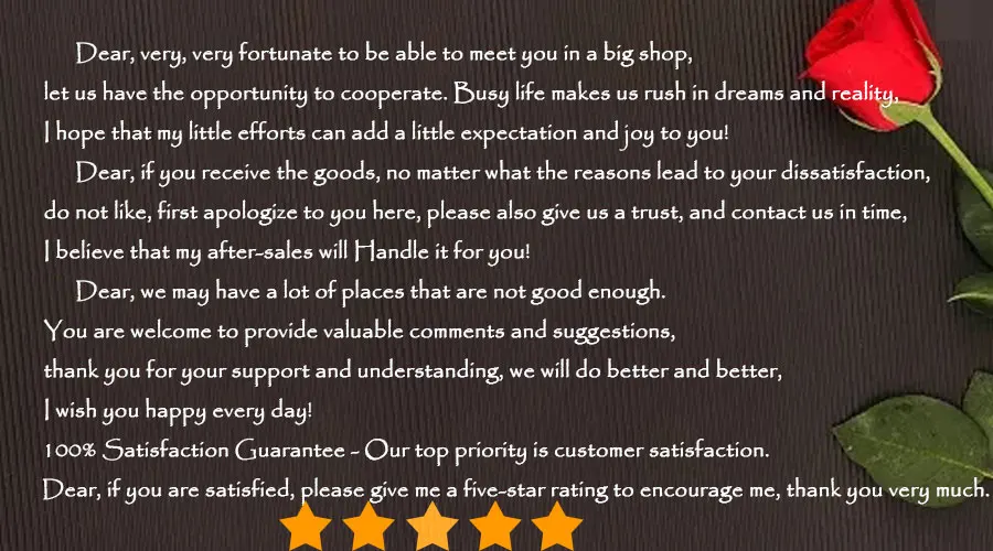Примечание: 1. Все продукты, предоставленные нашей компанией, имеют хорошее качество. После строгой проверки и упаковки, а затем отправки, мы постараемся избежать каких-либо проблем с качеством. 2. Если есть какие-либо повреждения в логистике товаров, пожалуйста, не стесняйтесь связаться с нами, мы решим проблему для вас как можно скорее! Не волнуйтесь! Пожалуйста, не ставьте оценку 1, 2, 3, 4 звезды! Спасибо за понимание, потому что они отрицательные! И спасибо за выбор нашей продукции! Все товары высокого качества! Если вам нужна помощь, пожалуйста, свяжитесь с нами! Пожалуйста, наслаждайтесь покупками здесь!
