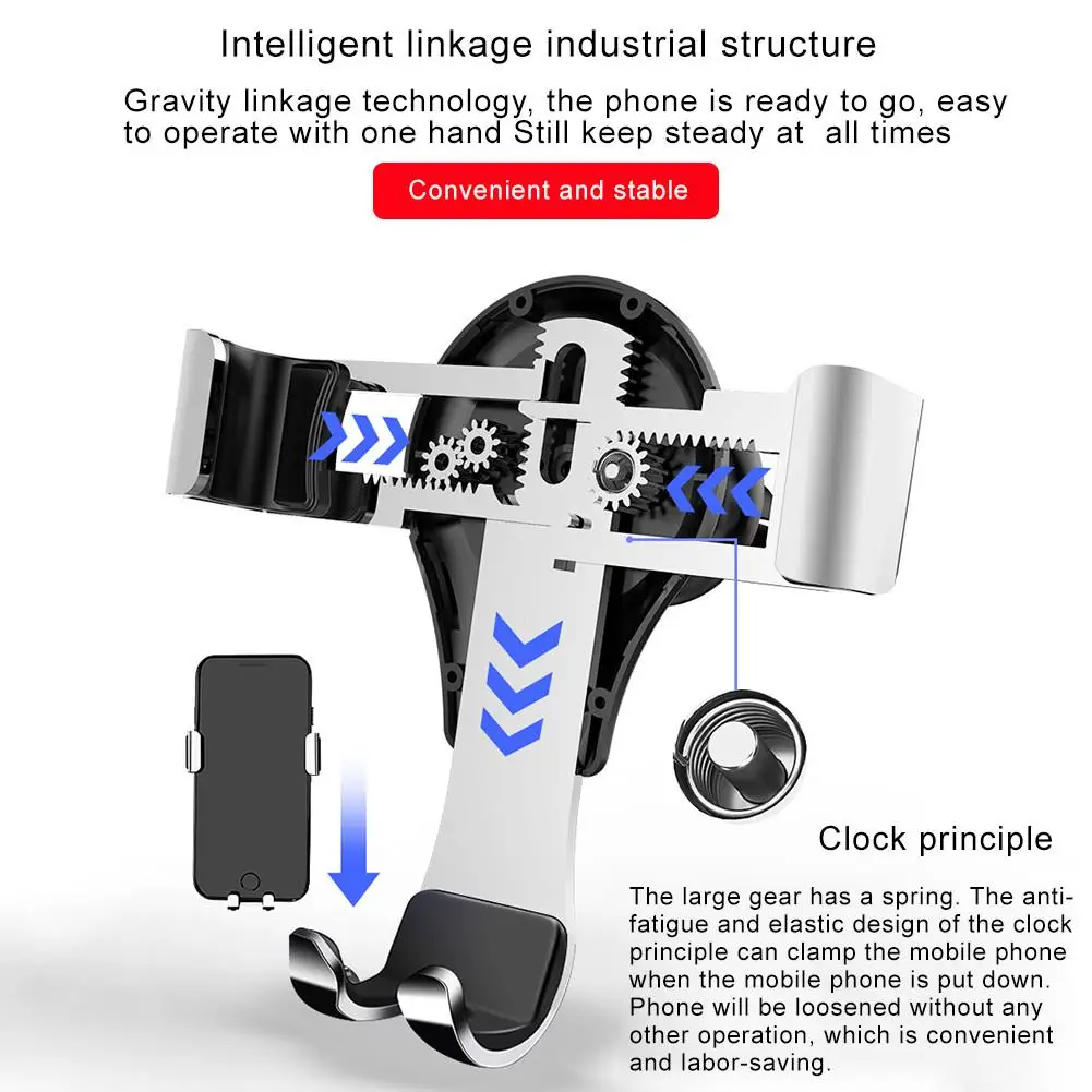Дизайн: инновационный дизайн, гравитационная связь и треугольная опора, автоматически зажимается, когда телефон надевается на держатель, стабильный и стабильный, отпустите автоматически, когда снимите телефон с держателя, легко и удобно.