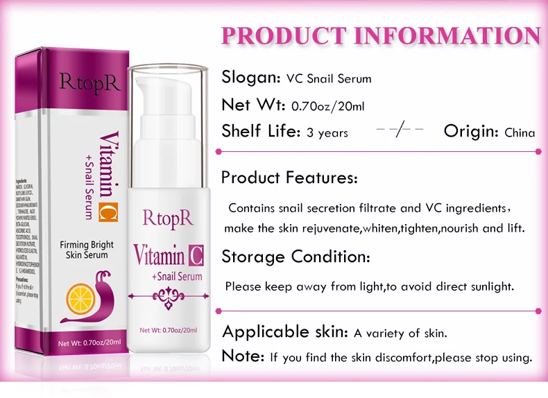 Содержит фильтрат секреции улитки и ингредиенты VC, делают кожу омолаживающей, отбеливает, затягивает, питает и подтягивает.