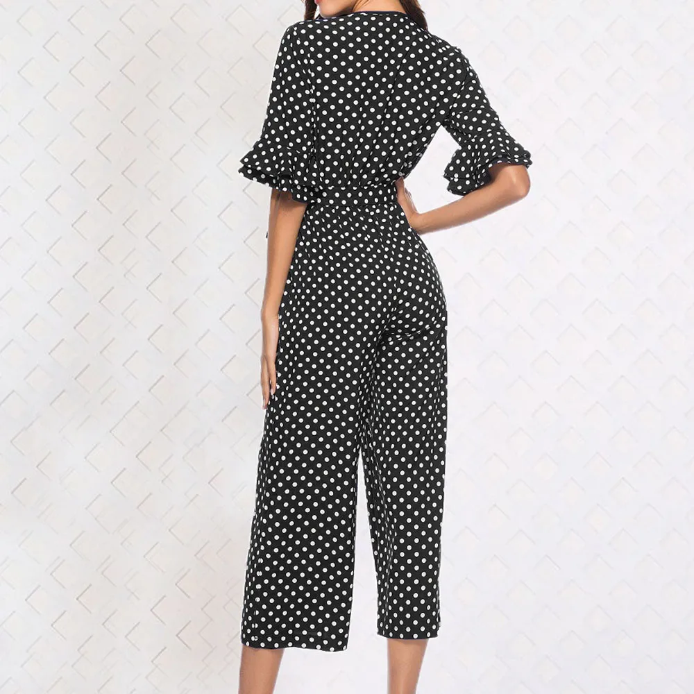 Женский комбинезон в горошек с v-образным вырезом и широкими штанинами