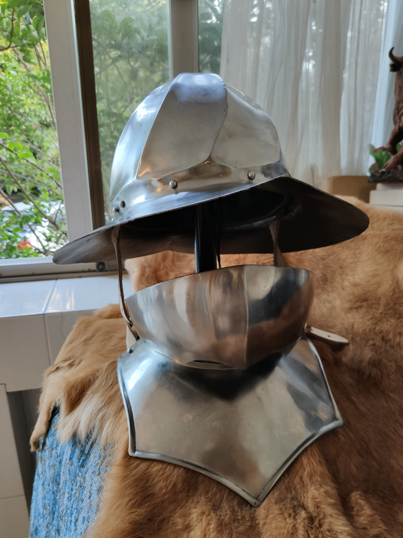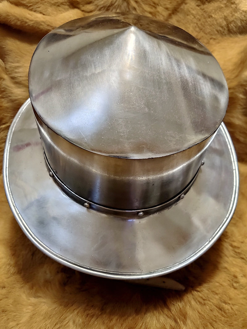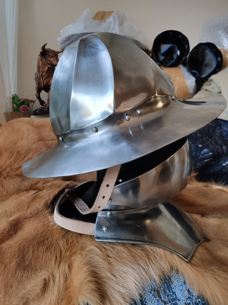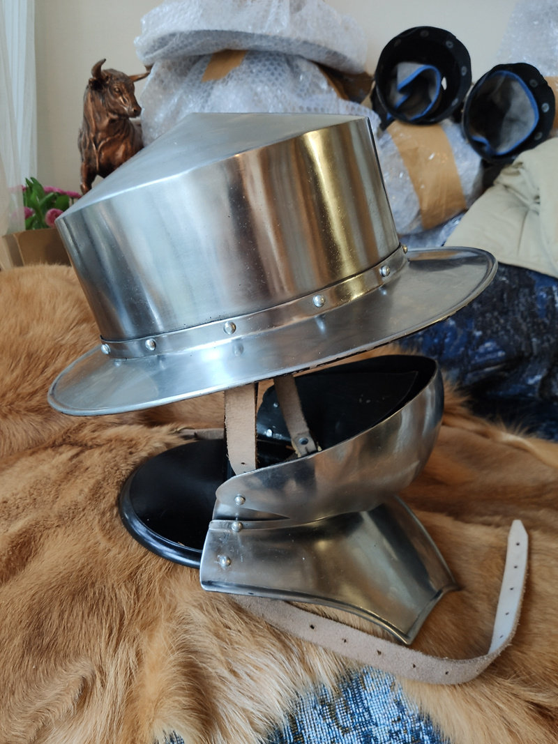 Шлем-это шлем, который подходит для использования по всей Европе. Он в основном используется в армии, а широкий козырек обеспечивает отличную защиту, особенно от атаки сверху (кавалерия) или бросания оружия и стрел от противника. Шлемы носили люди с начала 11 века, и они часто появлялись (в различных рукописях и древних фресках), но вначале Рыцарскому классу это не понравилось, потому что шлем не был «рыцаря».