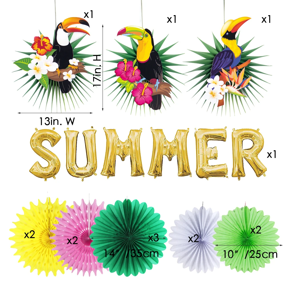 Эта тематическая вечеринка на день рождения включает в себя 15 штук 4 шт 16 ”/40 см вырезанный веера из папиросной бумаги (2 шт желтый + 2 шт белый) 2 шт. 14 "/35 см светильник зеленый веера из папиросной бумаги 2 шт 14 ”/35 см вырез веера из папиросной бумаги-фуксия 1 комплект (3 шт.) фанаты toucan palm leaves-Размер: 13 дюймов. (Ширина) * 17in. H 1 упаковка (14 шт.) темно-зеленые подвесные Вертлюги 4 шт 10 ”/25 см бумажные помпоны в виде цветов (1 белый + 1 светильник зеленый + 1 желтый + 1 фуксия) 1 шт. золотой фольги с днем рождения скрипт баннер