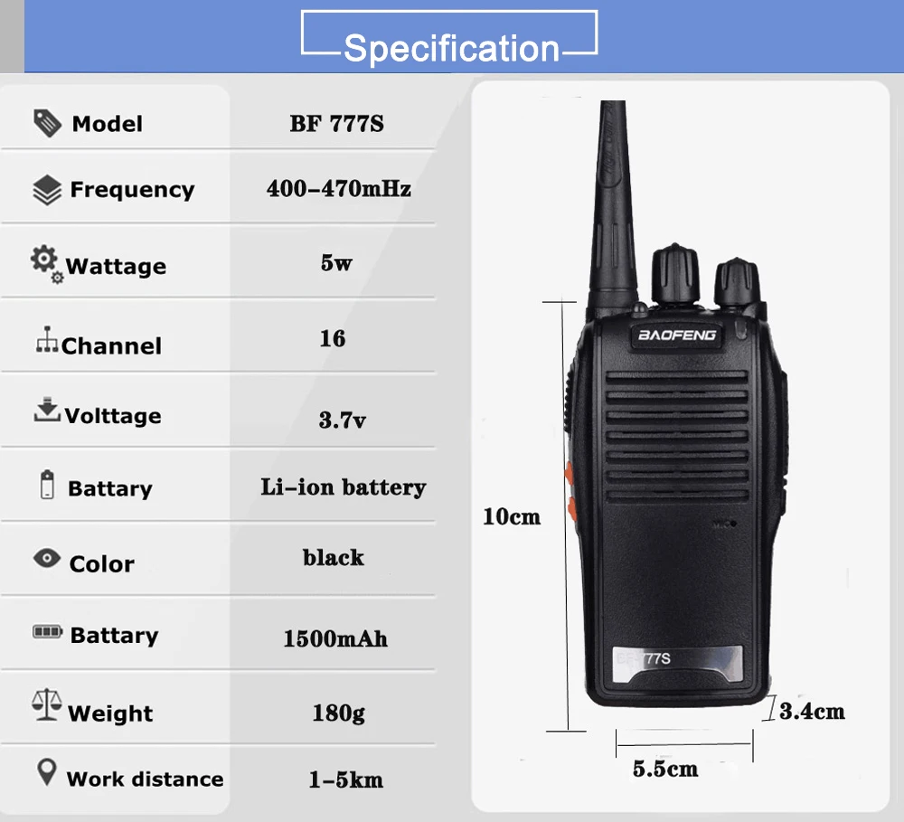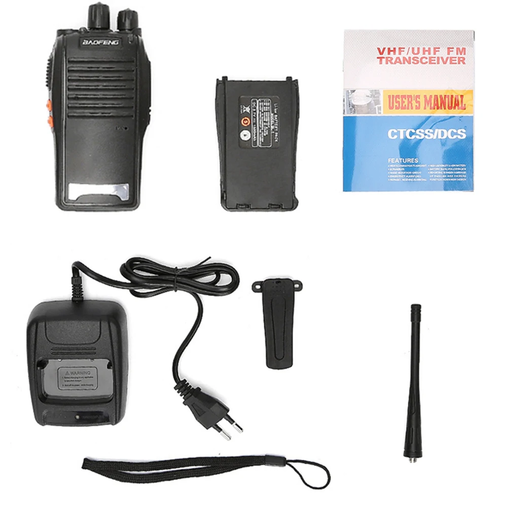 Упаковка включает в себя: 2 * портативная рация 2 * Батарея 2 * зарядное устройство 2 * зажим 2 * антенна 1 * Руководство пользователя Особенности: 1) Выход: ≤ 5 Вт 2) Частота: 400,00-470,мгц 3) 16 Каналы 4) Программа ПК 5) функция фонарика 6) 50 кодов CTCSS и 210 кодов DCS 7) уровень скважины 8) экономия батареи 9) Функция VOX (голосовая передача) 10) рабочий канал блокировки 11 Предупреждение о низком уровне заряда батареи 12) Защита от перенапряжения или низкого напряжения 13) монитор канала 14) TOT (таймер отключения времени) 15) функция скребка 16) шумоподавление 17) функция сканирования