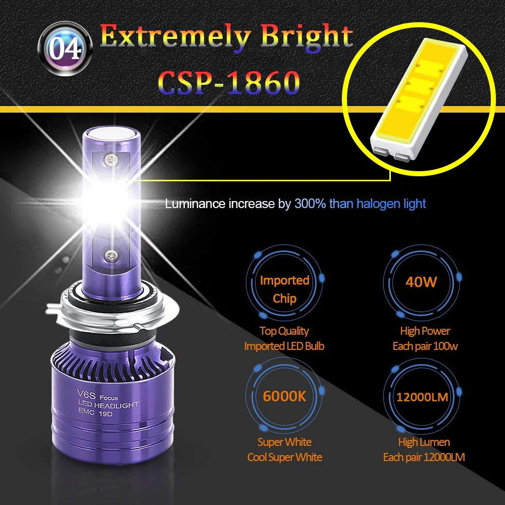 Одинарный свет: H7, 9005 = HB3, 9006 = HB4, 9012 = HIR2, H8 = H9 = H11,H1, H3, 880 = 881 = H27 (с 6 шт. csp-технология для светодиодов)