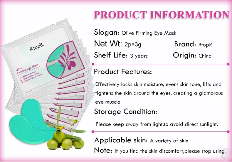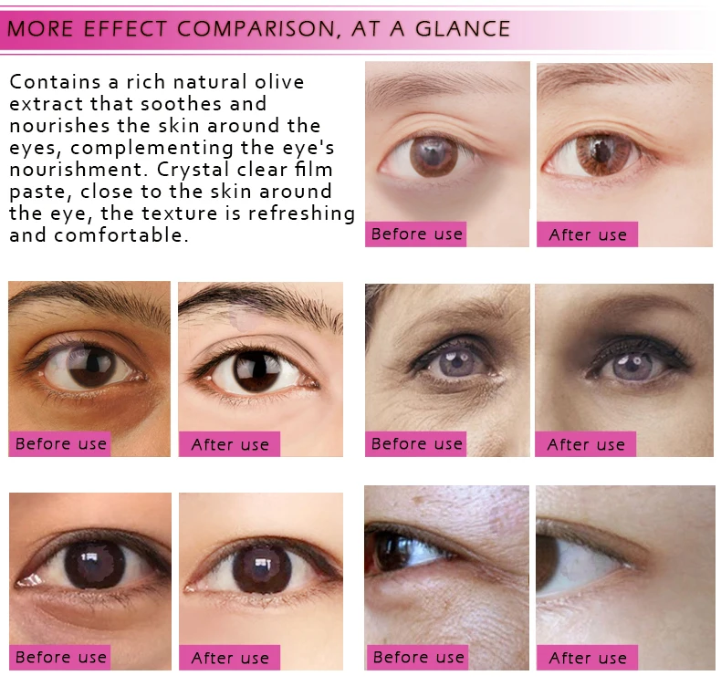 Содержит богатый натуральный оливковый экстракт, который успокаивает и питает кожу вокруг глаз, дополняя питание глаз. Кристально чистая пленочная паста, близкая к коже вокруг глаз, текстура освежает и удобна, которая эффективно фиксирует влагу кожи, выравнивает тон кожи, приподнимает кожу вокруг области вокруг глаз и создает гламурную мышцу вокруг глаз.