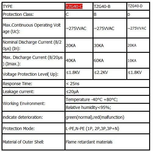 Пожалуйста, обратите внимание на эту ссылку только для 2P TZG40-C 20KA ~ 40KA 275V