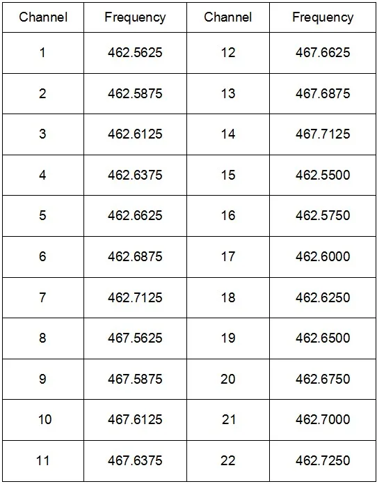 Примечание: 22CH-частота FRS/GMRS 462 МГц-467 МГц (для США, Мексики и Канады)