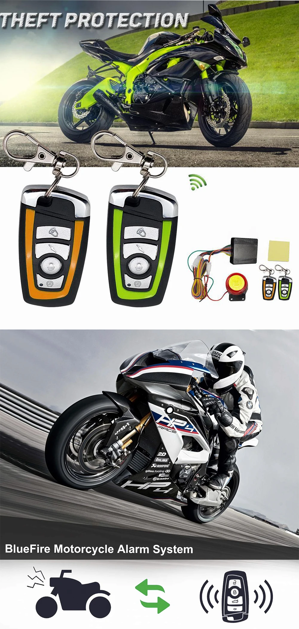 Это противоугонная система охранной сигнализации для мотоцикла, односторонний двойной цветной пульт дистанционного управления, подходит для большинства мотоциклов. Звуковой сигнал, не нужен ключ для вождения, прост в установке и использовании.