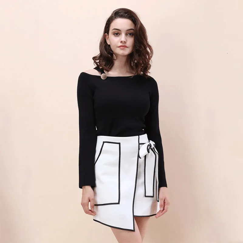 HDY Haoduoyi 2019 Женский черный пуловер с вырезом лодочкой женский свитер открытыми