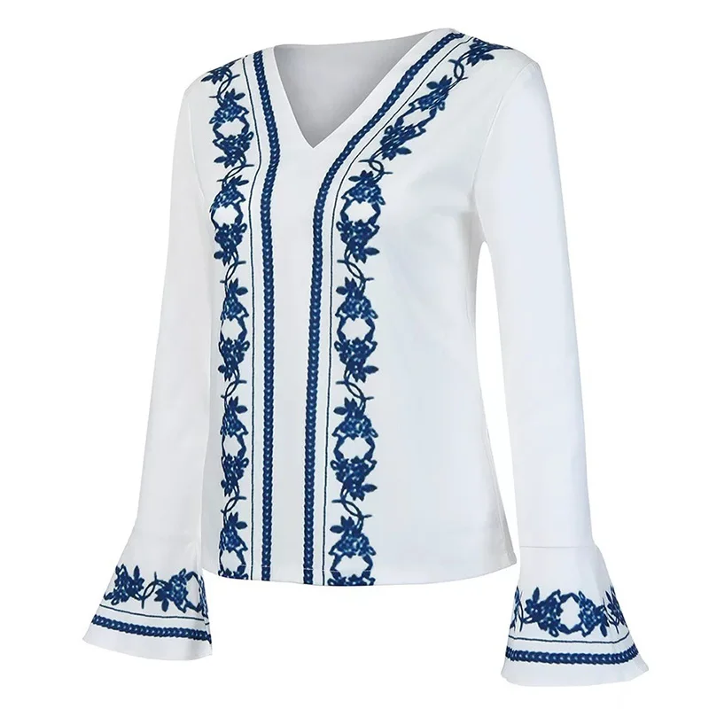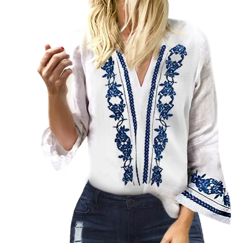 * Описание товара: женские топы, рубашки с v-образным вырезом, длинный рукав-колокол, цветочный Белый Модный Элегантный Новый