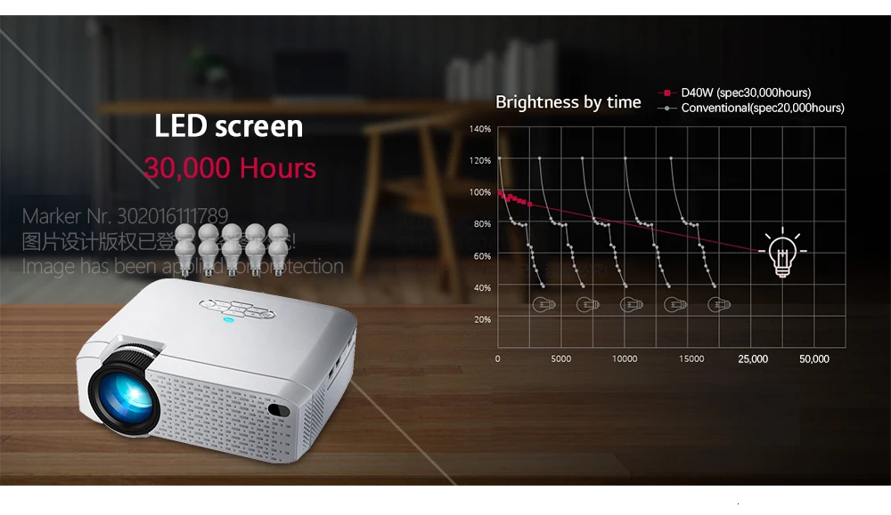 30000 часов Срок службы лампыЯЕсли вы используете его каждыйДень в течение трех часов, затем вы можете использовать его в течение 10000 дней, около 27 лет. Это действительно экономично, чем телевизор.