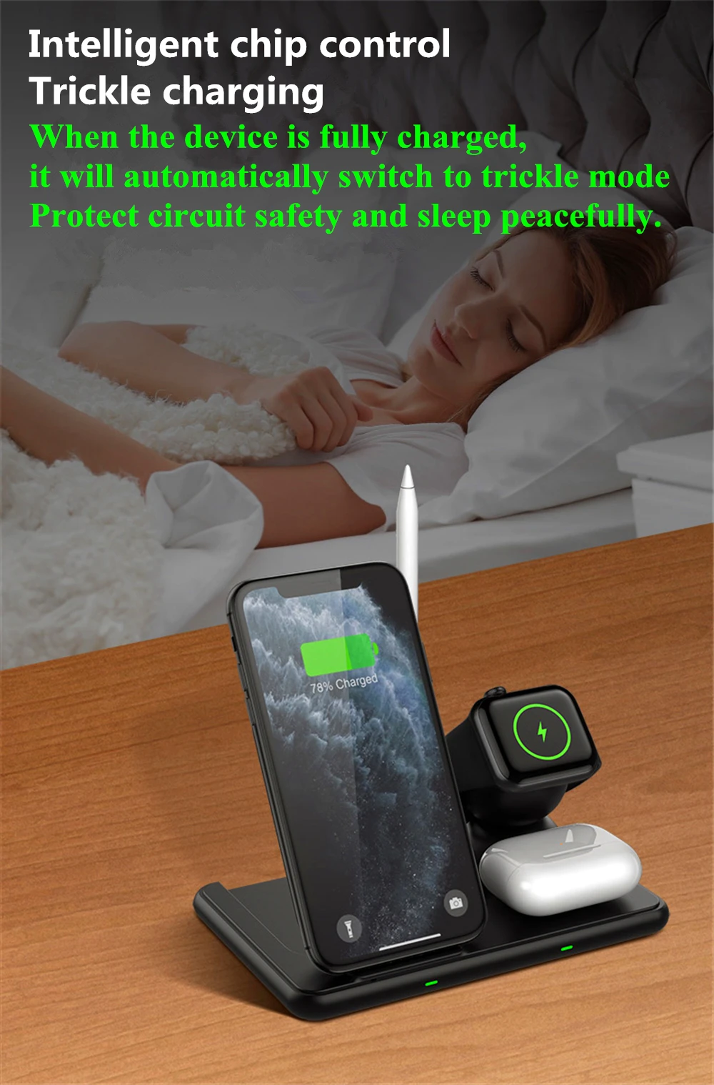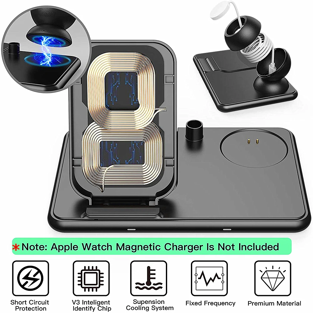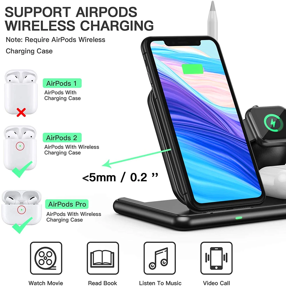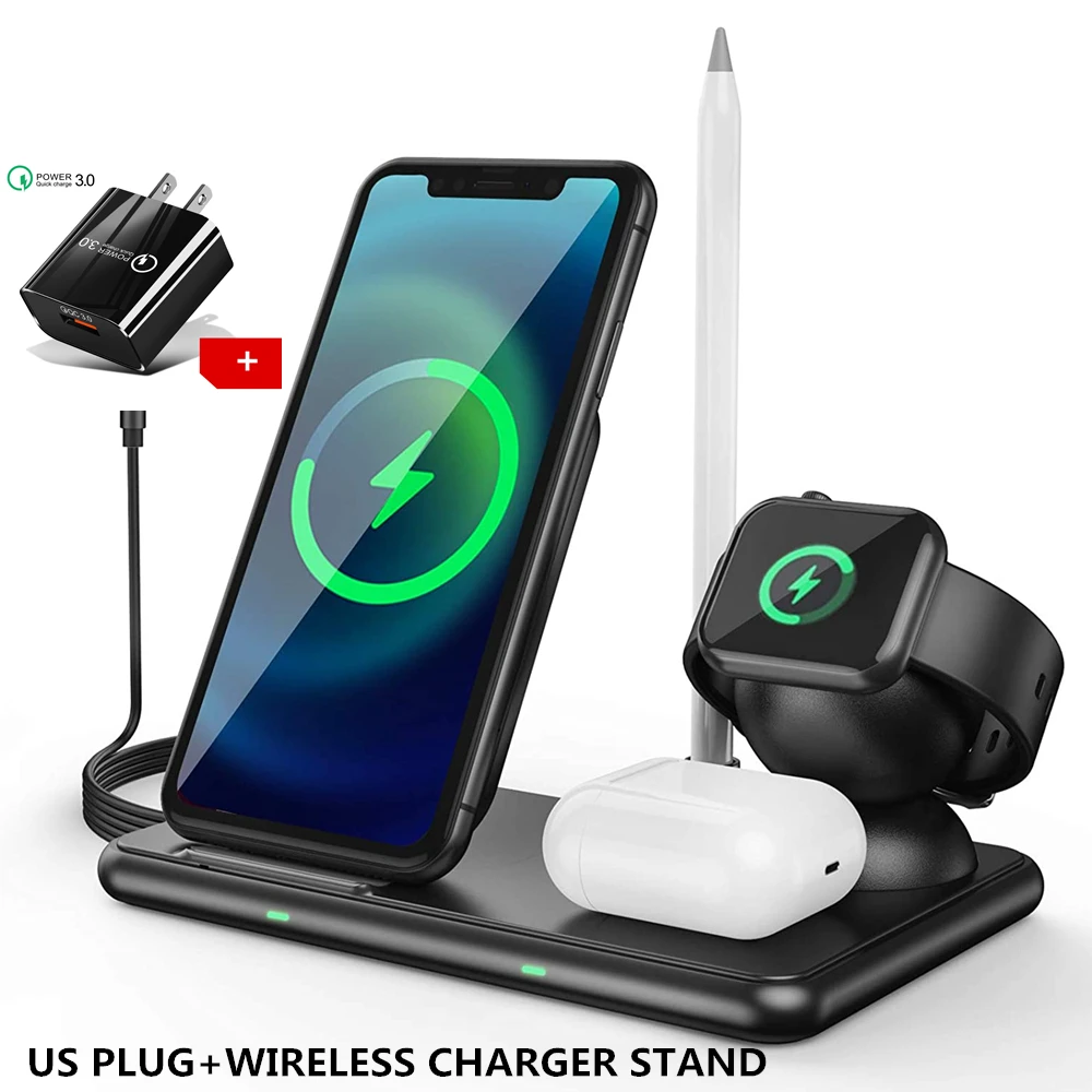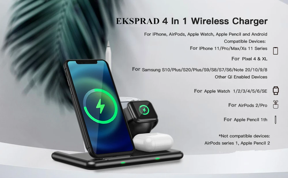 Беспроводная зарядная станция для продуктов apple может одновременно заряжать несколько устройств, для iPhone 12/11/ 11 Pro/ Xs Max / Xr / X / 8/8 Plus, для Apple Watch series 5/4/3/2/1/SE Airpods 2/Pro для Samsung S10/S10 Plus/ S9 / S9 Plus / S8 / S8 Plus / Note 9 / Note 8 и другие наушники с поддержкой Qi. Зарядная док-станция для 1-го поколения Apple pencil.