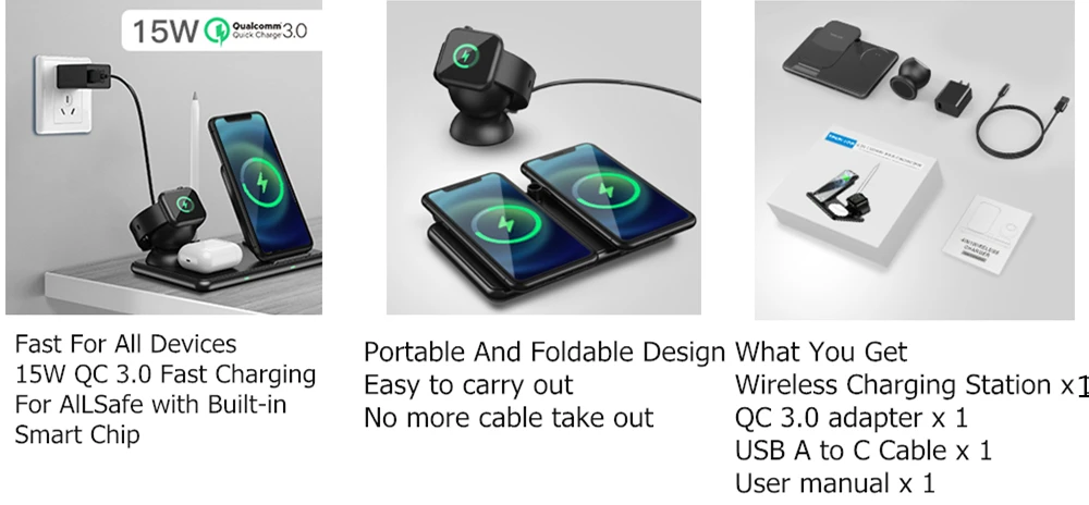 Беспроводная зарядная станция x 1 USB-C кабель для зарядки x 1 Руководство пользователя x 1 QC 3,0 Adpater x 1 * Примечание: 1. Если продукт, который вы приобрели, не включает адаптер QC 3,0, мы не отправим адаптер QC 3,0. 2. Магнитное зарядное устройство Apple Watch в комплект не входит