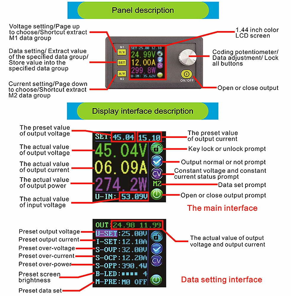 ЖК-дисплей и функция вольтметра/амперметра, вы можете просмотреть предустановленное напряжение/ток, входное напряжение, выходное напряжение/ток, выходную мощность и т. д.