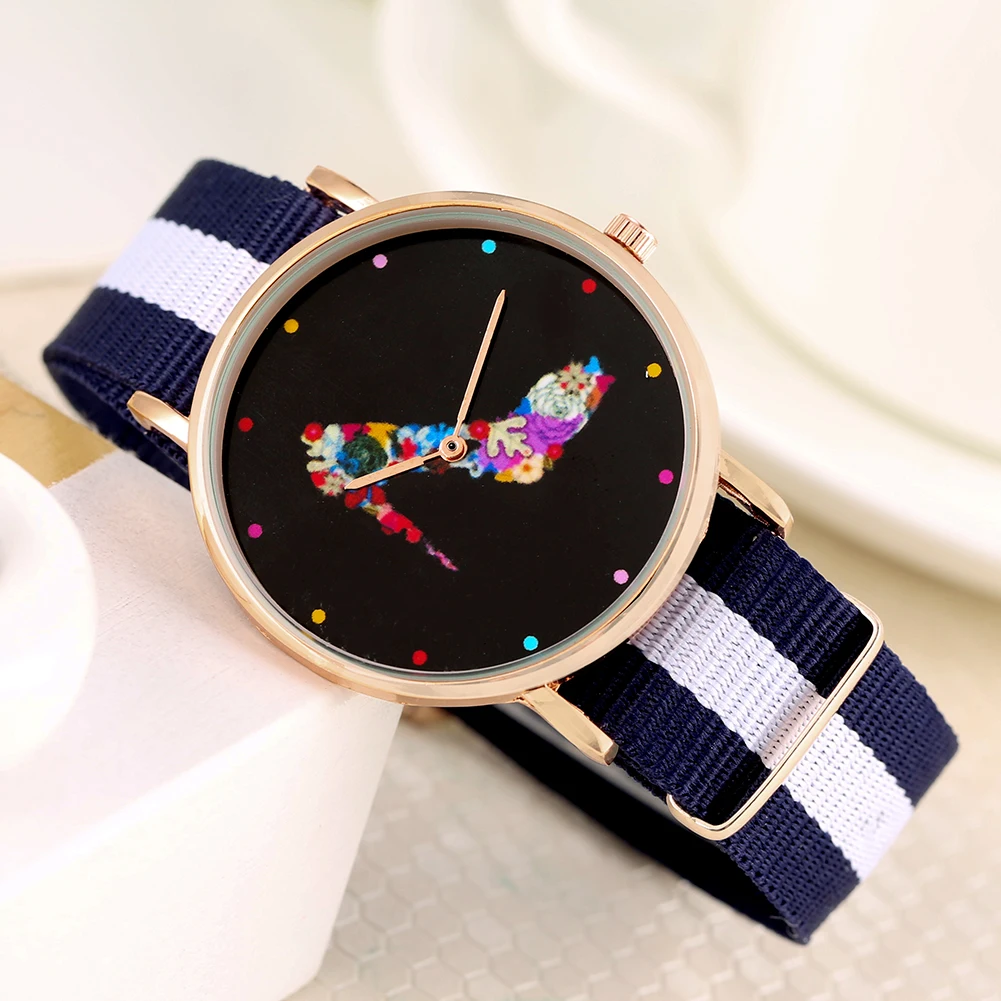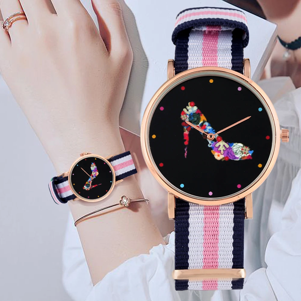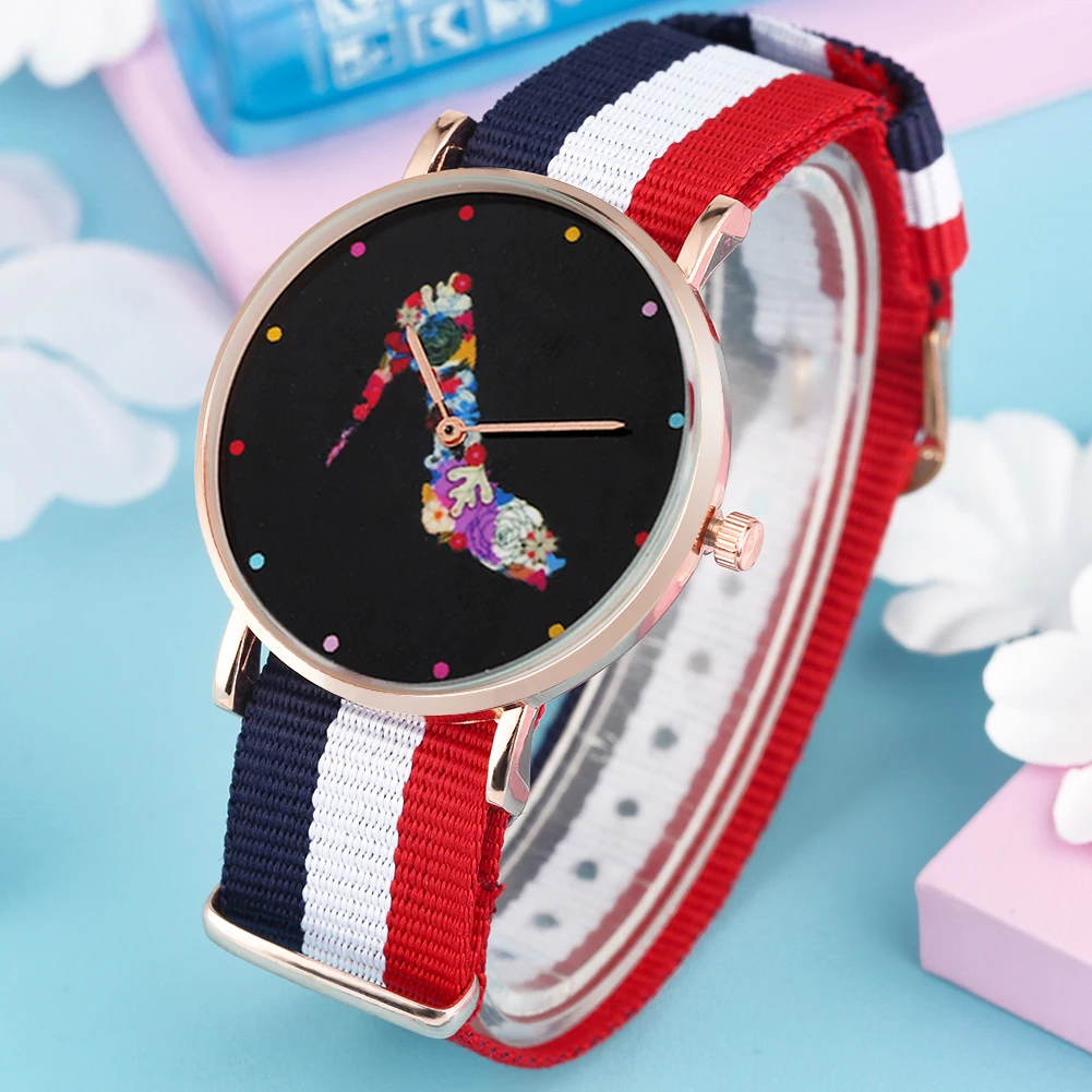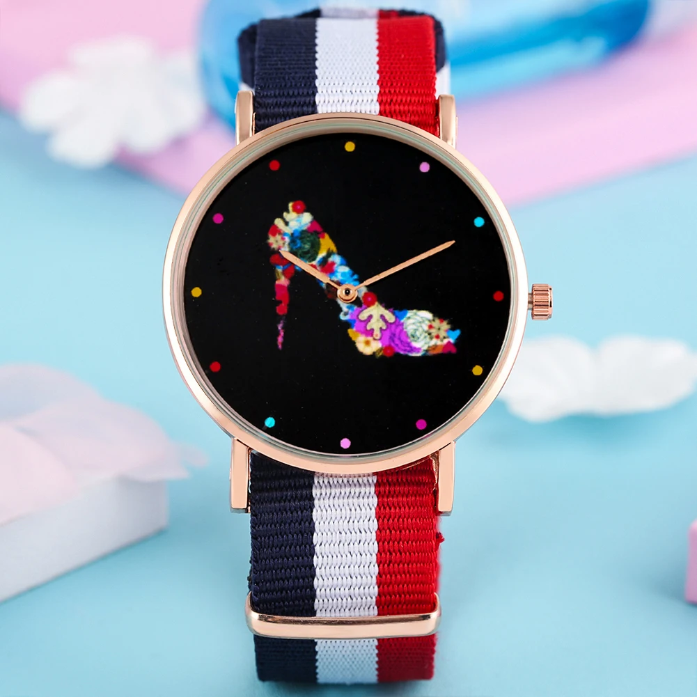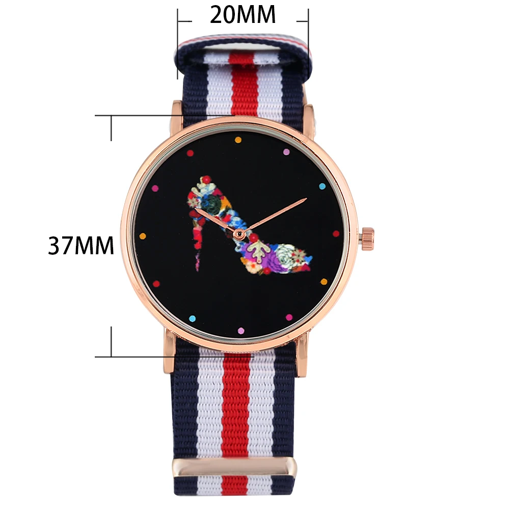 Уникальный внешний вид: цветные туфли на высоком каблуке с разноцветным циферблатом и футляром из сплава, а также нейлоновый ремешок придают Вам различный и яркий темперамент.