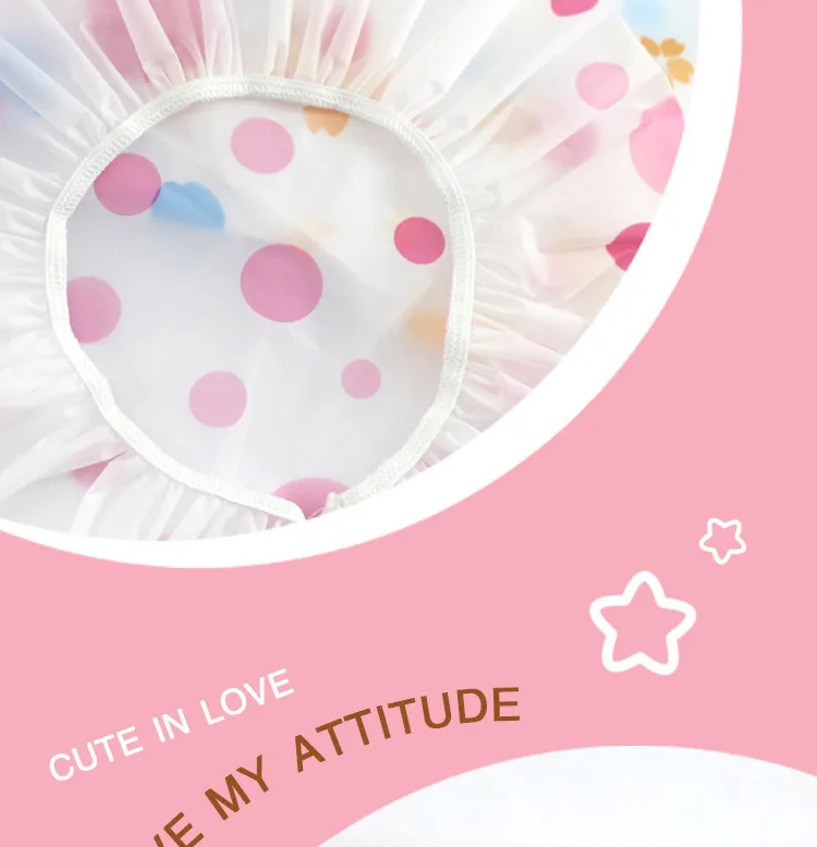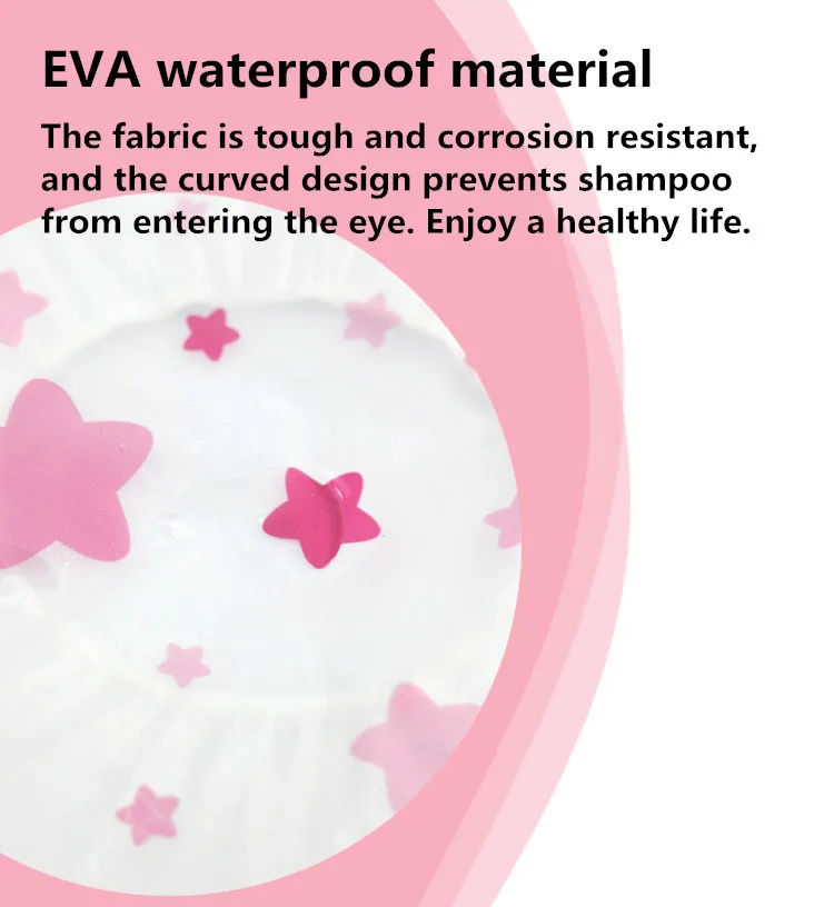 Особенности: EVA водонепроницаемый материал, ткань жесткая и устойчивая к коррозии, изогнутый дизайн, чтобы предотвратить попадание шампуня в глаза. Наслаждайтесь здоровой жизнью. Изящные и изысканные принты делают шапку для душа более совершенной и многослойной. Наслаждайтесь хорошим временем купания.
