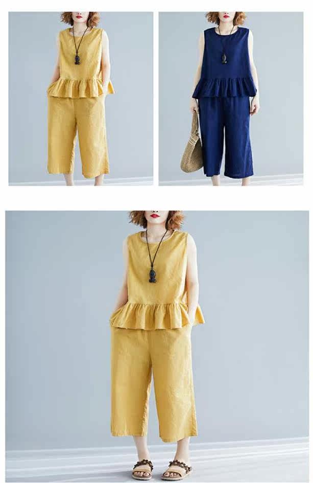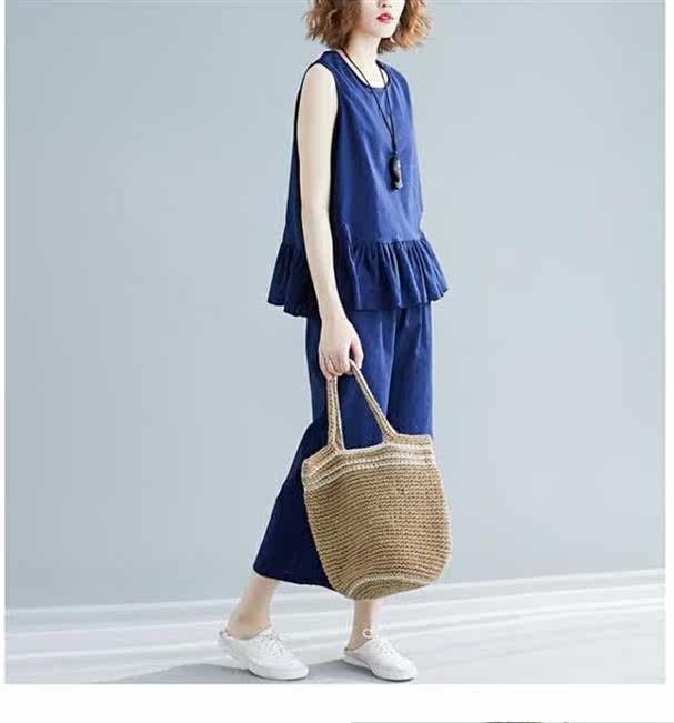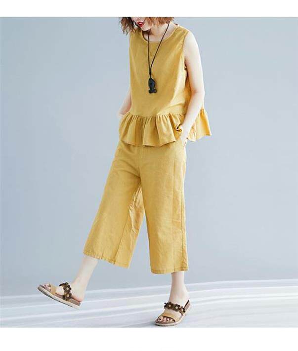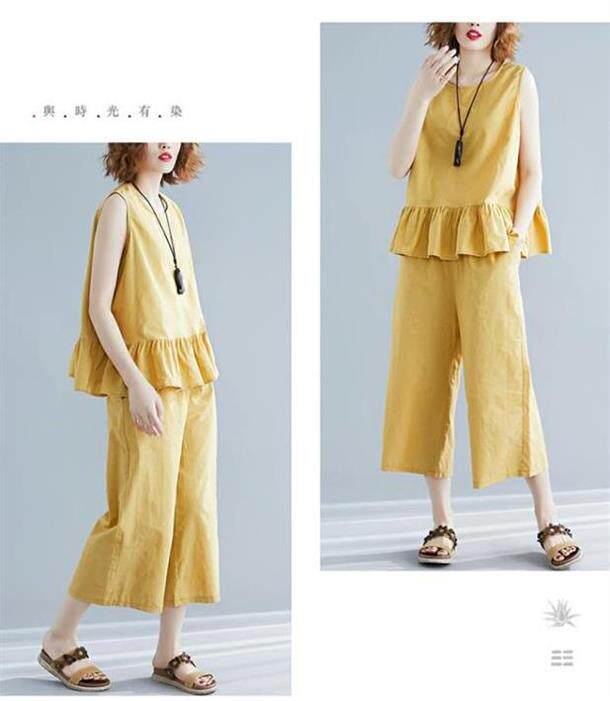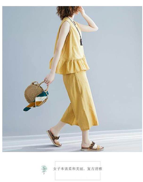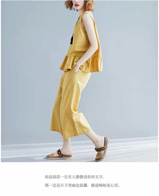 Новые летние корейские женские комплекты из двух предметов 2019 повседневные без рукавов, сверло вверх, эластская Талия, широкие брюки длиной до икры, комплекты брюк AE811