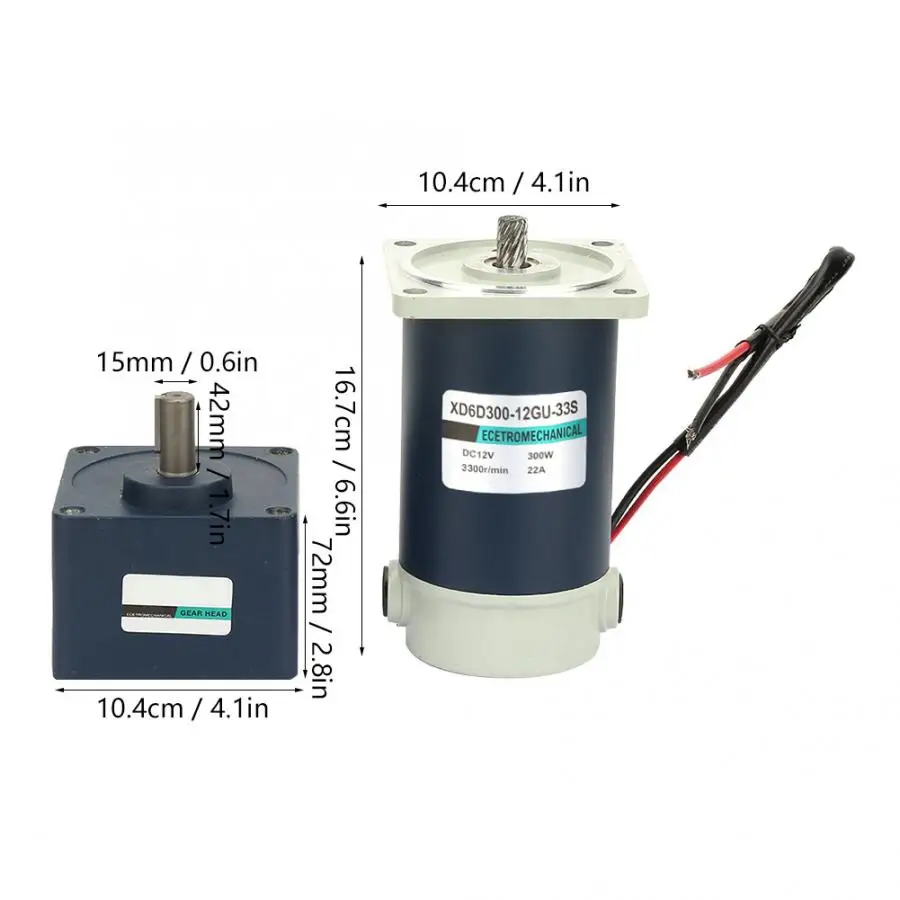 1. Продукт состоит из двух частей: Мотор постоянного тока и редуктор. Номинальное напряжение мотора составляет 12 В, номинальная мощность-300 Вт, кручение-7,96 кг. См, Номинальная скорость-3300 об/мин, коробка передач имеет различные коэффициент уменьшения, и подходящей модели могут быть выбраны согласно необходимой скорость вывода данных.