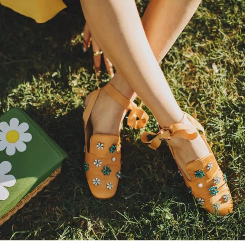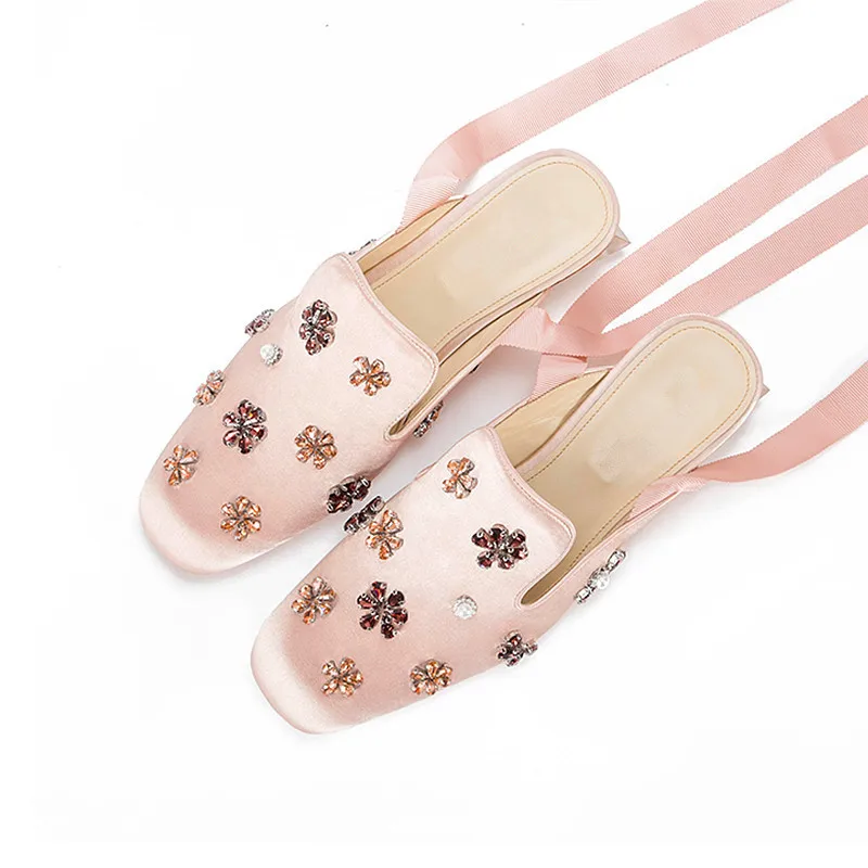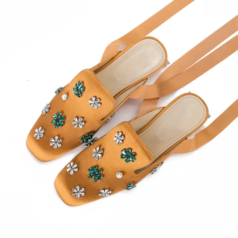 Стразы Украшенные атласные сандалии Босоножки с открытой пяткой; Женские тапочки с прозрачными каблуками ленты и ремешками через подъем, декорированные кружевом и бисером на шнуровке Женская обувь на плоской подошве 2019 осень