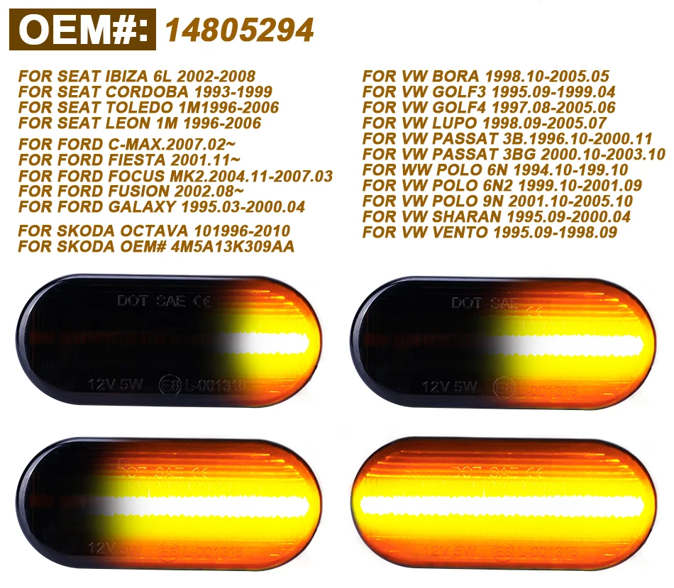 Боковой габаритный светильник указателя поворота для SEAT/Skoda/Ford/VW/Golf/Passat -- Безопаснее в дороге -- Легко установить, подключить и играть -100% новый и высокое качество -- IP 67, водонепроницаемый и ударопрочный Подходит для следующих типов транспортных средств: OEM #14805294 Для SEAT Ibiza 6L 2002-2008 Для SEAT Cordoba 1993-1999 Для SEAT Toledo 1M 1996-2006 Для SEAT Leon 1M 1996-2006 Для Skoda Octavia 1U 1996-2010 Для Skoda OEM # 4M5A13K309AA Для Ford C-Max 2007,02 ~ Для Ford Fiesta 2001,11 ~ Для Ford Focus MK2 2004,11 ~ 2007,03 Для Ford Fusion 2002,08 ~ Для Ford Galaxy 1995,03 ~ 2000,04 Для VW Bora 1998,10-2005,05 Для VW Golf3 1995,09-1999,04 Для VW Golf4 1997,08-2005,06 Для VW Lupo 1998,09-2005,07 Для VW Passat 3B 1996,10-2000,11 Для VW Passat 3BG 2000,10-2003,10 Для VW Polo 6N 1994,10-199,10 Для VW Polo 6N2 1999,10-2001,09 Для VW Polo 9N 2001,10-2005,10 Для VW Sharan 1995,09-2000,04 Для VW Vento 1995,09-1998,09 Посылка включает в себя: 2 шт. боковой маркер светильник указатель поворота светильник
