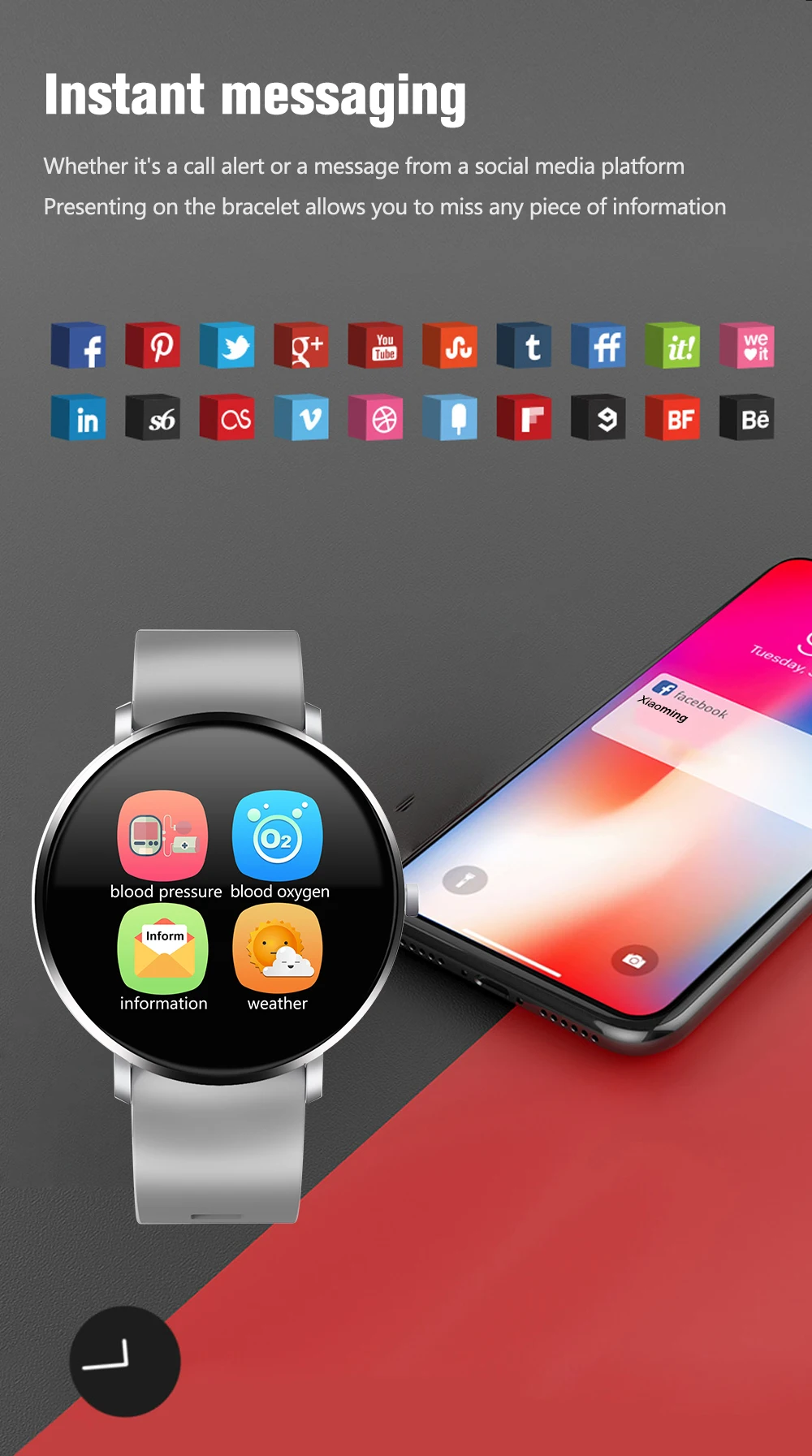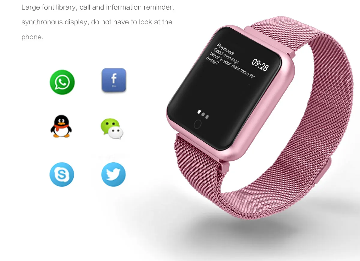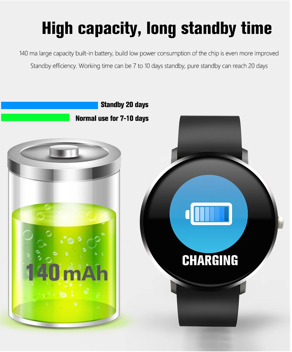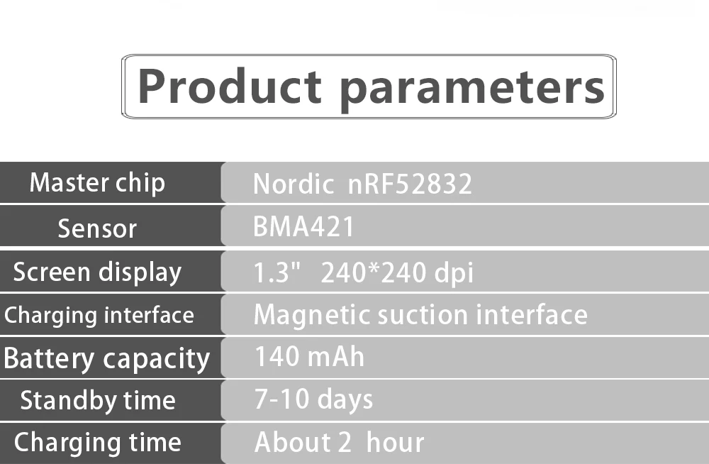 1. Водонепроницаемый уровень: IP67 2. поддерживаемые языки: Zhongjian, Zhongfan, датский, чешский, немецкий, итальянский, польский, тайский, шведский, финский, Голландский, Португальский, английский, корейский, испанский, японский, французский, русский, арабский, украинский 3. Системные требования Android 4,4, IOS 9,0 и выше, Bluetooth 4,0 4. Экран, разрешение 1,3 дюйма 240*240 TFT 5. Материал ремешка: силиконовый ремешок 6. Цвет: черный, серый 7. Работа: Полный сенсорный экран, боковой пресс-назад 8. Емкость аккумулятора: 140 мАч 9. Время в режиме ожидания: 7-10 дней 10. Метод зарядки: Магнитный зарядный кабель USB 11. Время зарядки: около 2 часов