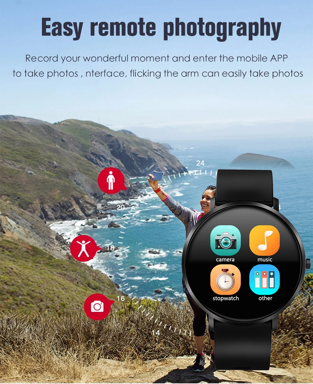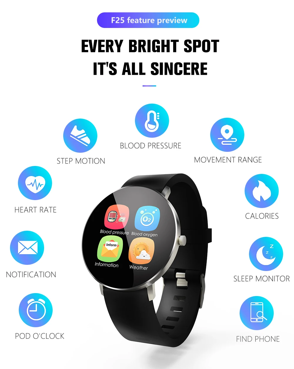 Мониторинг сердечного ритма, кровяное давление, кислород крови, шаг, расстояние, калории, несколько режимов упражнений, мониторинг сна, напоминание о звонке (номер звонящего/Имя, сообщение Напоминание, управление музыкой, погода, будильник, напоминание о потере, напоминание о сидячем положении, поднимите руку, чтобы осветить экран, возьмите пульт дистанционного управления, И т. д.