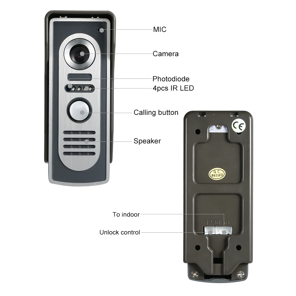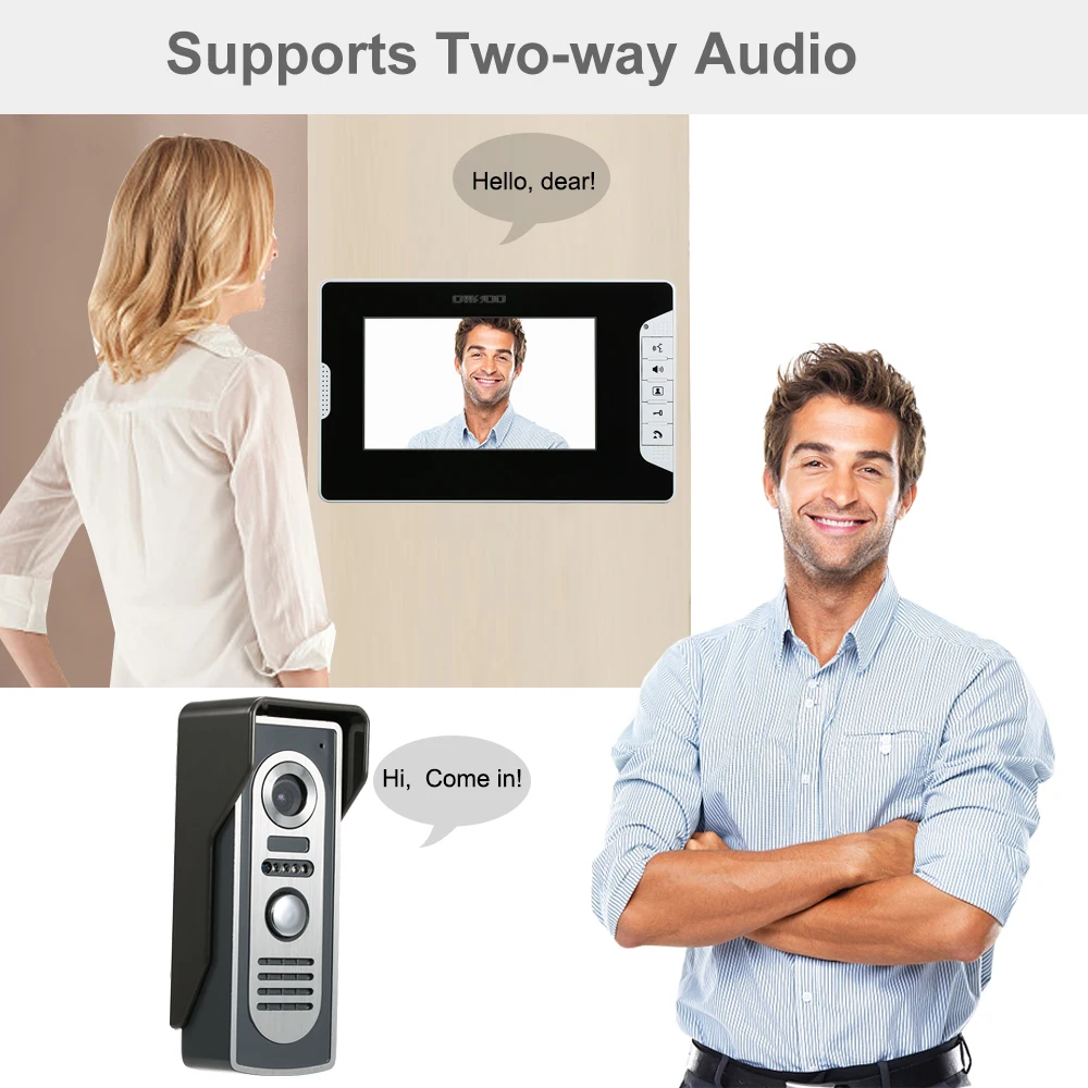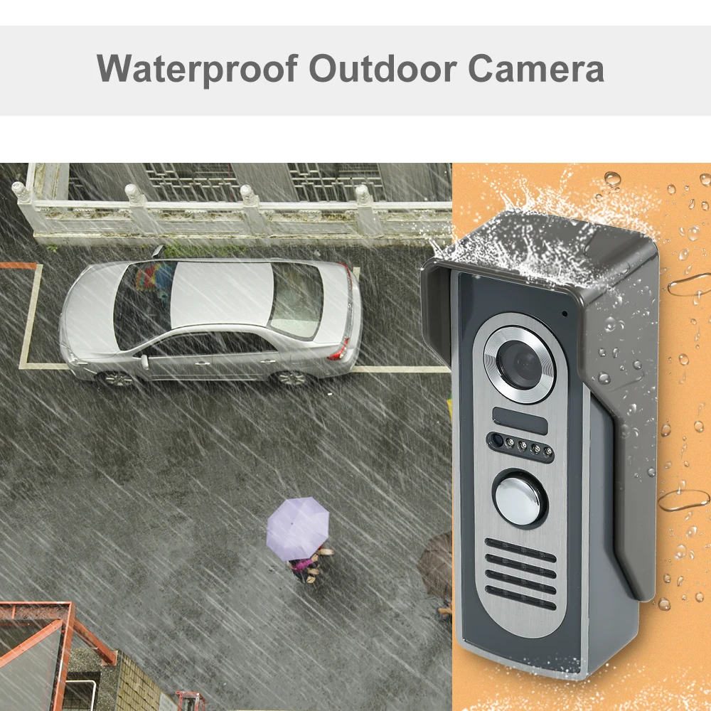 Этот 7 дюйм цвет LCD Видео дверь телефон включает в себя одну наружную камеру с водонепроницаемой функцией и два внутренних монитора. Он поддерживает визуальную Интерком, удаленную разблокировку, инфракрасное ночное видение и непромокаемую функцию. Вы можете следить за тем, что произошло перед вашей дверью с помощью внутреннего монитора. Он предоставляет вам четкие изображения для мониторинга как днем, так и ночью из-за ИК-светодиодов. Он широко используется в квартирах, домах, гостиницах, офисах, общественных зданиях, виллах, фабриках и т. д.