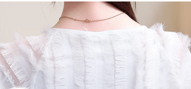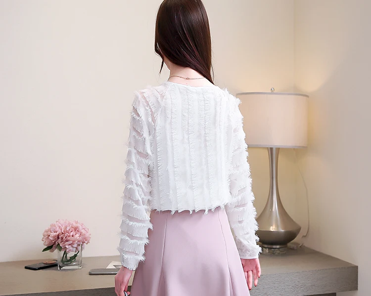 Однотонная белая женская шифоновая блуза с кисточками, открытая, на шнуровке, с длинным рукавом, элегантный корейский стиль, OL Blusa, тонкий топ с круглым вырезом, 2019
