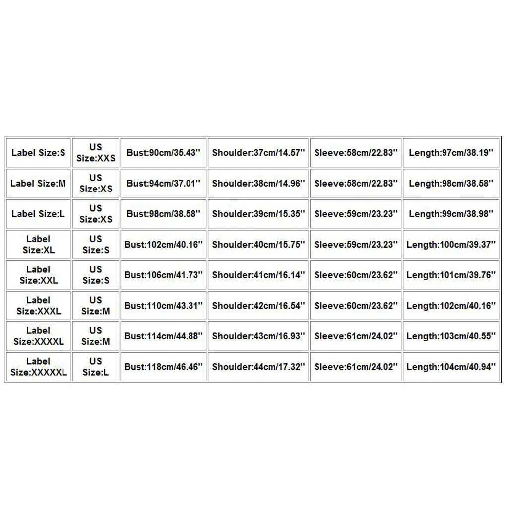 | Размер этикетки: XXL | Размер США: S | Обхват груди: 106 см/41,73 дюйма | Ширина плеч: 41 см/16,14 дюйма | Рукав: 60 см/23,62 дюйма | Длина: 101 см/39,76'' |