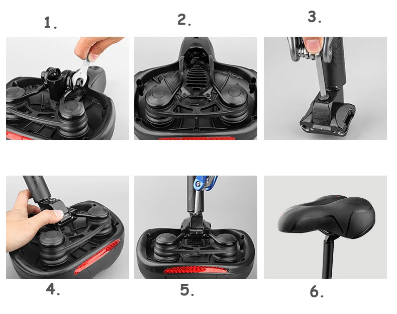 Двойная направляющая трубка сиденья: 1. Расслабьте винт и снимите зажим 2. Снимите код клипа, как показано на рисунке. 3. Выключите обмоточный провод и откройте двойной зажим 4. Поместите сиденье в середину зажима. 5. Затяните гайку с внутренним шестигранником 6. Установка завершена