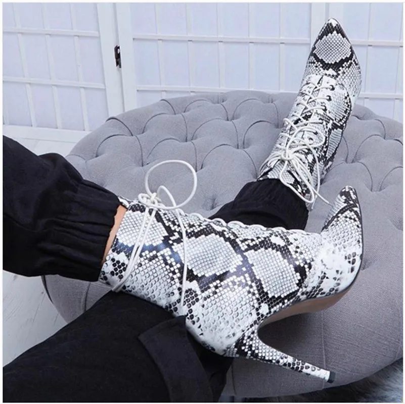 Женские ботильоны со змеиным узором, с перекрестными ремешками, Ttiletto, с острым носком, на шнуровке, 2019