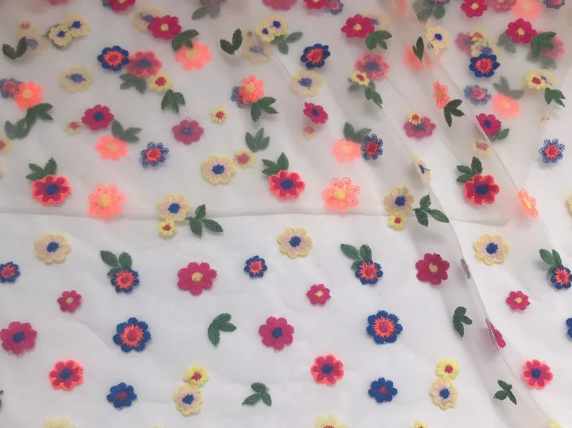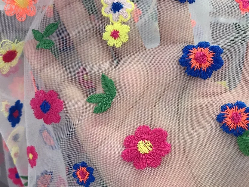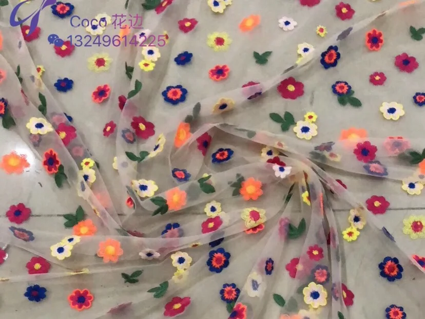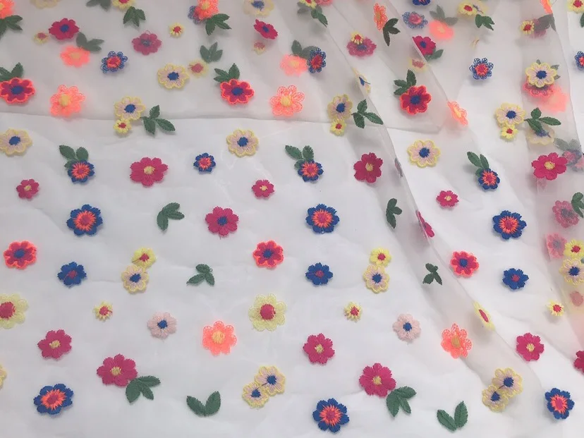 White transparent soft gauze pure cotton embroidery color small flower dress fabric exquisite embroidery gauze fabric Gate width: 130cm or so Material: White transparent screen yarn, color cotton thread embroidery Color: Multicolor Elasticity/Shrinkage: No elasticity, stretching force, good vertical feeling, good layout, fabric belongs to high-quality fabric, soft and comfortable. Fabric usage: It can be used to make clothes of different seasons, such as paty dress, wedding dress, pillow, bag, cheongsam, dress, table cloth, children's dress, dress and window screen, etc. Features: skin-friendly fabric, dense screen bottom, sagging, skirt, cheongsam, children's clothes, women's clothes are beautiful, exquisite workmanship, non-threading and off-threading, embroidered cotton thread embroidery, soft and comfortable. Washing instructions: hand wash, no bleaching, hang dry, no dry cleaning