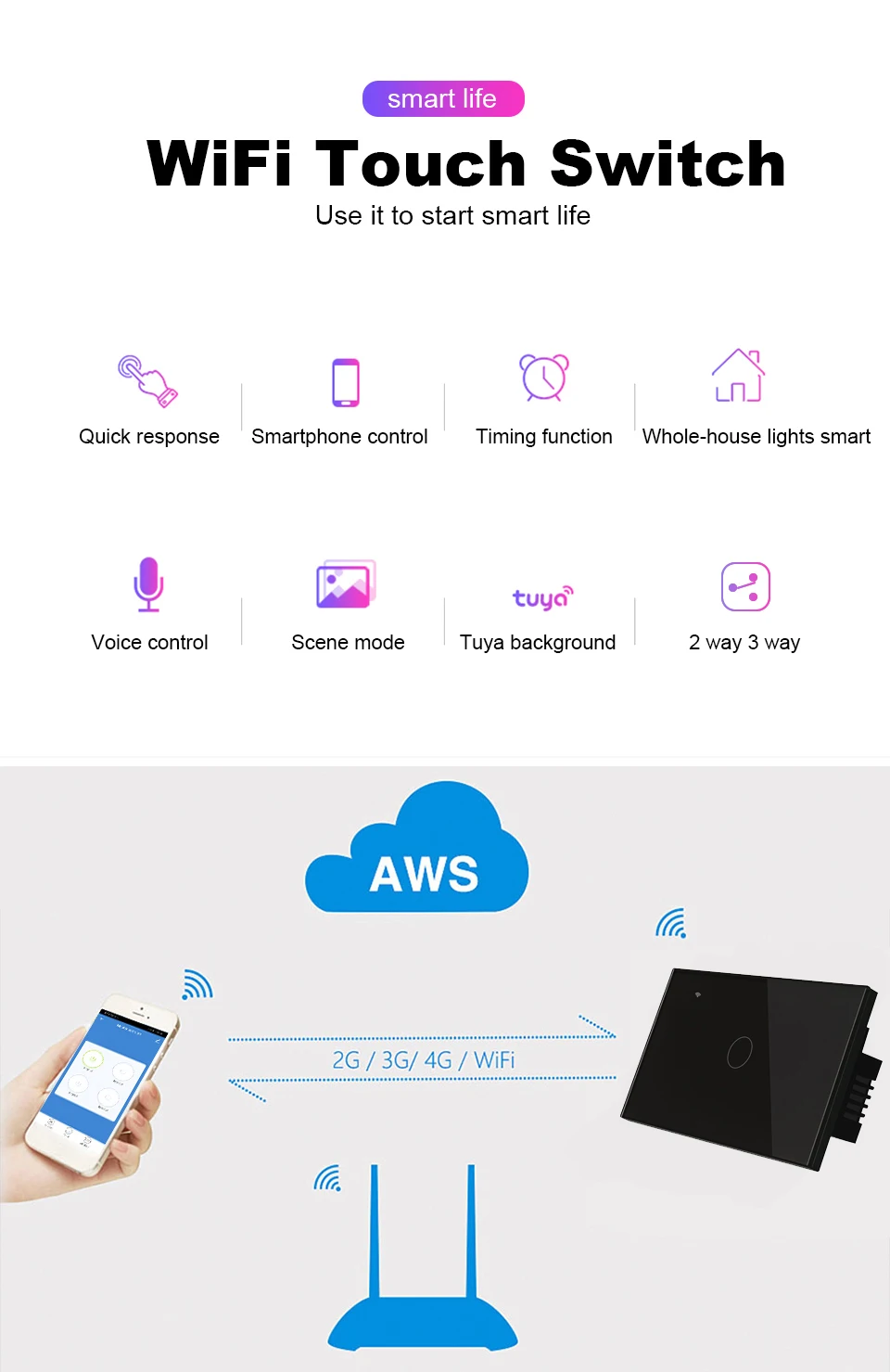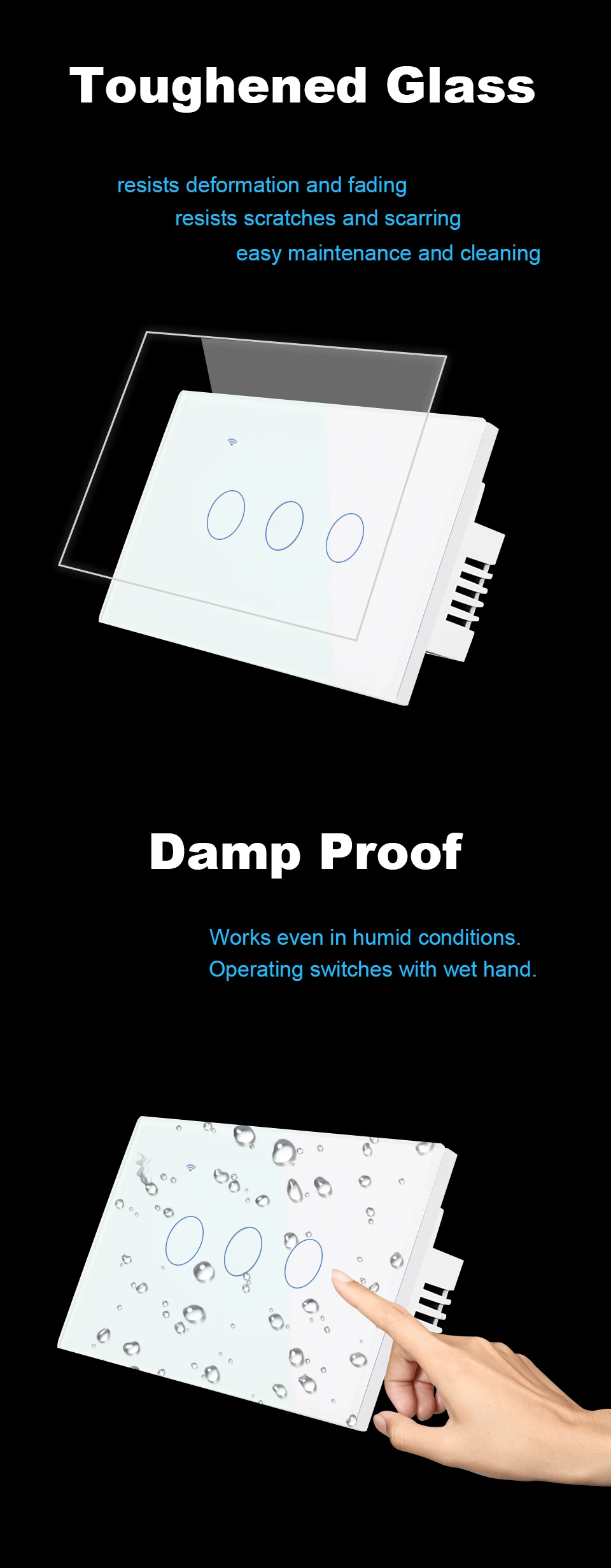 A. Модель: сенсорный переключатель WiFi B. Напряжение: 100-240 В C. Стандарт беспроводной связи: Wi-Fi 2,4 ГГц D. Рабочая среда: -30 ~ 70 градусов Цельсия; Менее 95% относительной влажности Е. Материал панели: закаленное Хрустальное стекло F. Основной материал: пластик G. Срок службы: 100000 время работы