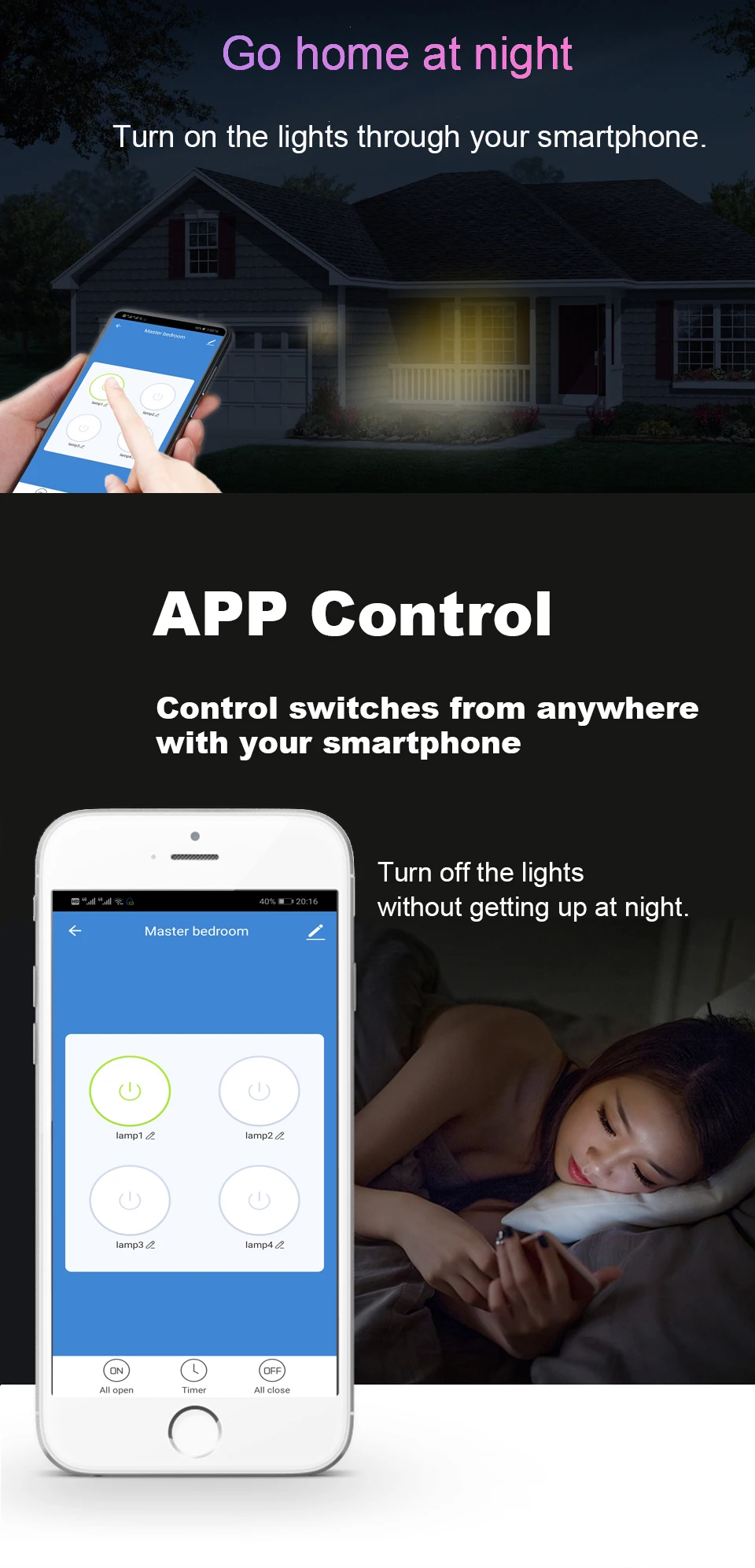 A. Пульт дистанционного управления Smart App: удобно управлять светом и индикатор подсветки с помощью приложения Tuya независимо от того, где вы находитесь. (Совместимость с Android и iOS.) кроме того, вы можете легко поделиться им со своей семьей, чтобы управлять огнями вместе с приложением Tuya. B. Голосовое управление без рук: Совместимость с Amazon Alexa и Google Home для легкого голосового управления, когда ваши руки не свободны, обеспечивая вашу умную жизнь с гораздо большим удобством. С. 2/3 способ: переключатели управляют лампами в разных положениях. Особенно подходит для установки на лестничной клетке вверх и вниз лестниц, что удобно для ночного освещения вверх и вниз лестниц. D. Настроить свой собственный Scence: один ключ контролирует мульти переключатели. Например, установите свой дом, чтобы автоматически выключить выключатели, когда вы выходите из дома. Сэкономит ваше время. Е. Настройка таймера: Возьмите полный контроль над своим домом и офисными огнями интеллектуально с функцией таймера в вашем приложении.
