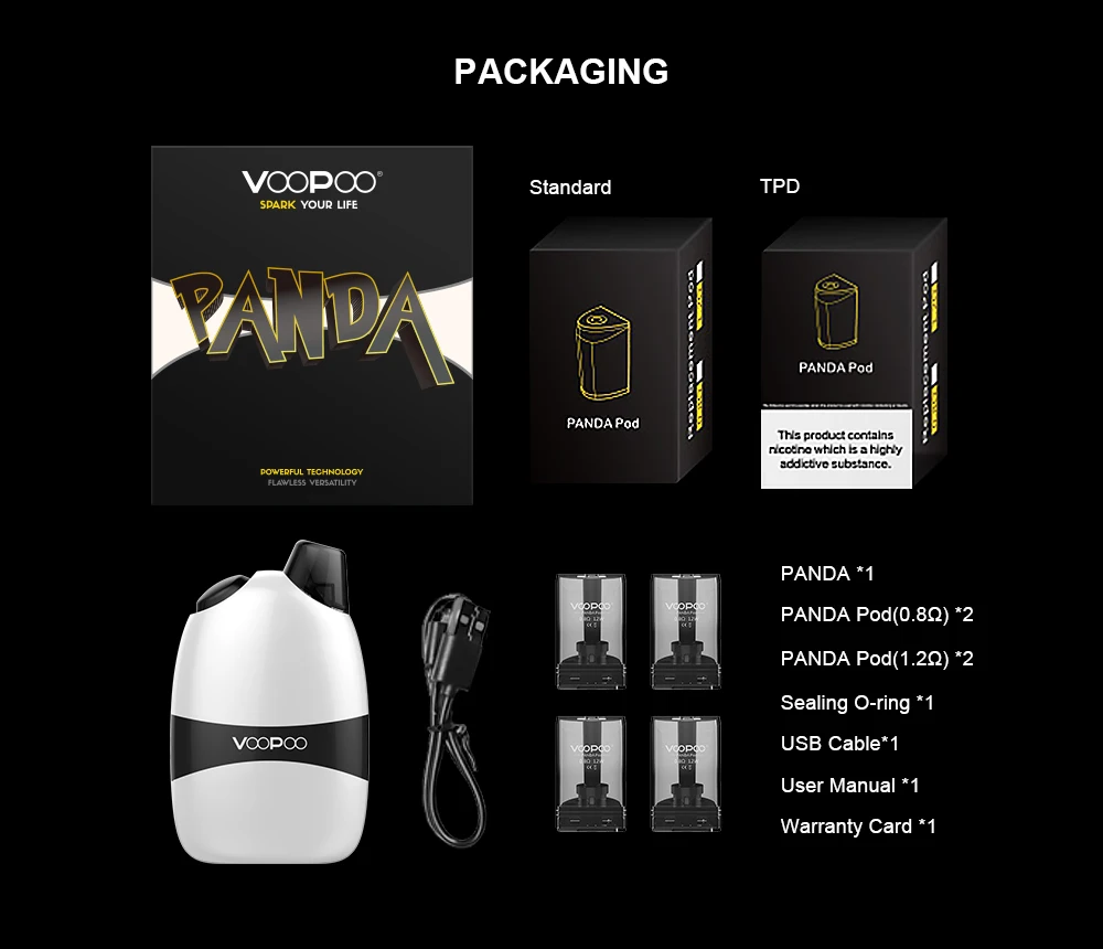 Набор Panda поставляется с двумя стручками (Ом/1,2 Ом) для различных соков, Ом стручками для никотиновой соли и Ом стручками для обычного электронного сока.