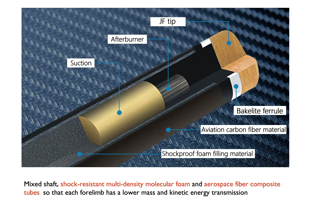 Твердое, чем закаленное стекло Черная технология forelimb использует аэрокосмический чистый углеродный волокнистый композитный материал, Внешний вид-карбоновый черный, полый корпус делает вал более легким, Но углеродное волокно может быть более мощным, чем твердое дерево cue Ударопрочный пенопластовый наполнитель, Смешанный вал, ударопрочные Многослойные молекулярные пены и аэрокосмические волокна композитные трубы, Таким образом, что каждая Сторона имеет более низкую массу и передачу кинетической энергии, Без вышивки и без эрозии, хорошая прочность, бесшовные стыки, высокая прочность передачи 11 зубчатый шарнир из титанового сплава