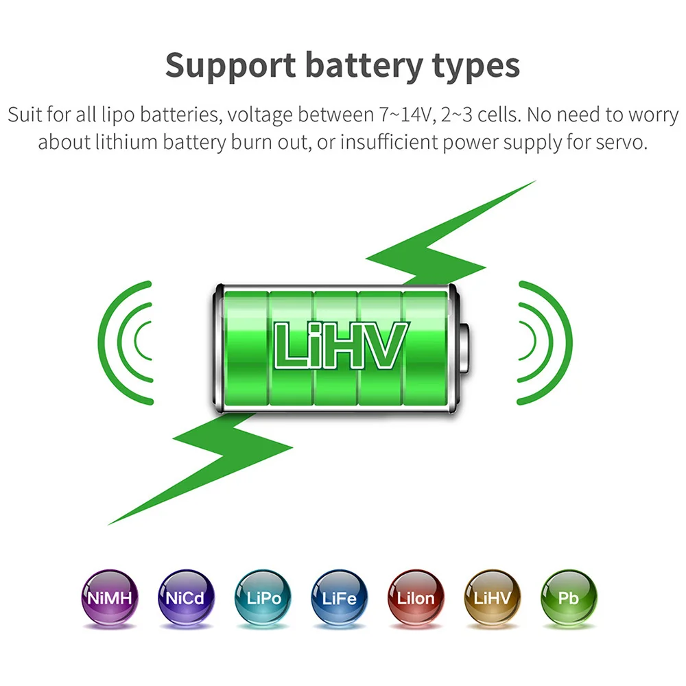 Поддерживает все lipo батареи, напряжение между 7-14 в, 2-3Ячеек. Не нужно беспокоиться о том, что литиевая батарея выгорит, или недостаточный источник питания для сервопривода.