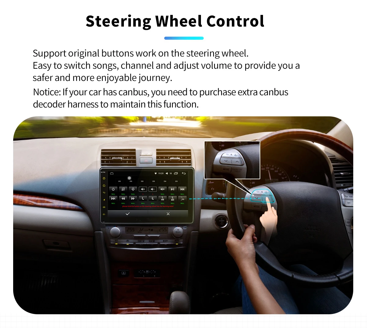 Более безопасное вождение-легко переключение песен/каналов радио и громкости через SWC. Примечание: 1) Пожалуйста, нажмите ниже картинку или скопируйте эту ссылку для видео YouTube, чтобы узнать больше. SWC: //youtu.be/kOBpU-ZWbOQ?t=140 2) Если ваш автомобиль имеет canbus, необходим декодер canbus для выполнения этой функции.