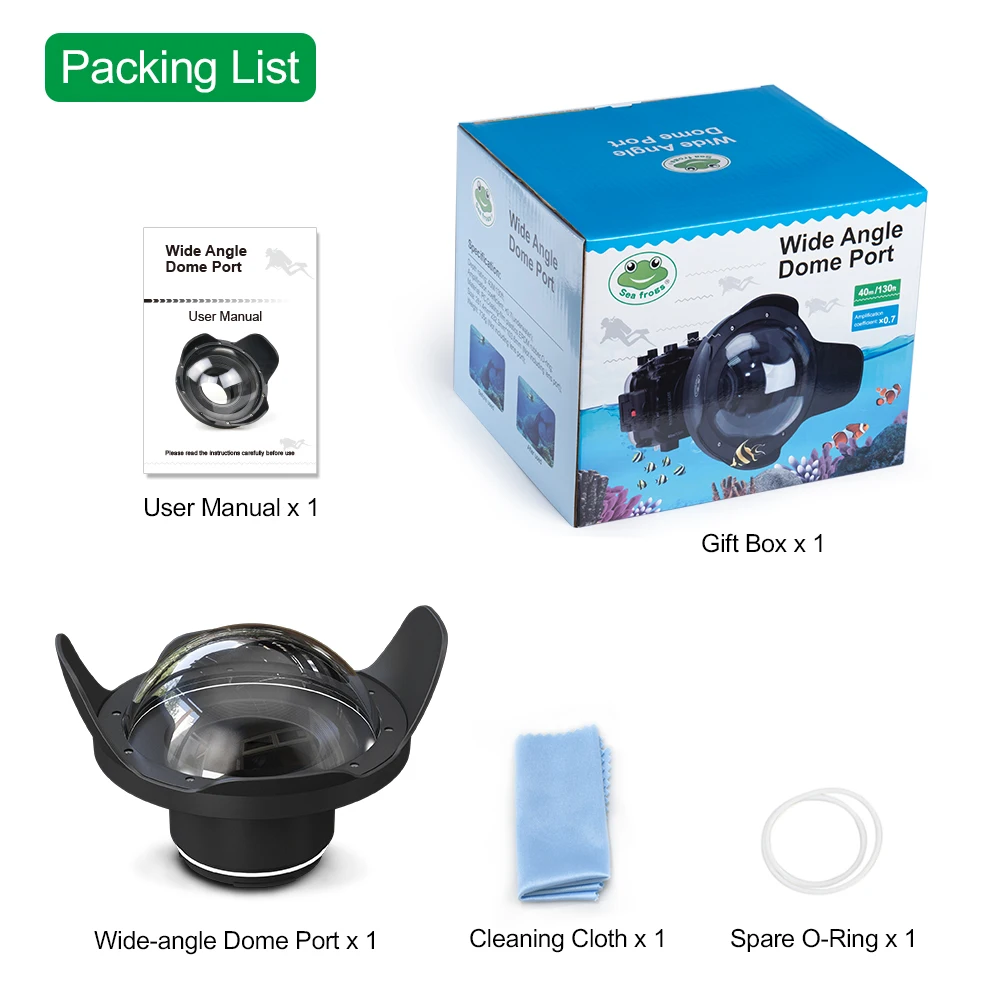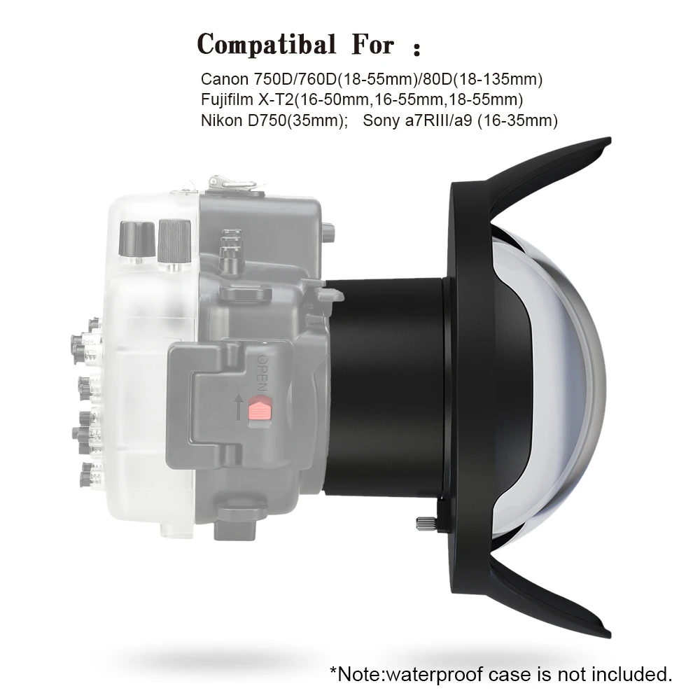 Seafrogs: Canon EOS 750D/760D: (18-55 мм/18-135 мм) X-T2 Fujifilm: (16-50 мм/16-55 мм/18-55 мм) X-T3 Fujifilm: (16-50 мм/16-55 мм/18-55 мм) Sony A7 Pro: (28-70 мм/16-35 мм/24-70 мм) Sony A7-II Pro: (28-70 мм/16-35 мм/24-70 мм) Sony A7R-III/A7-III: (16-35 мм) Sony A9: (16-35 мм) Meikon: Canon EOS 80D: (18-135 мм)