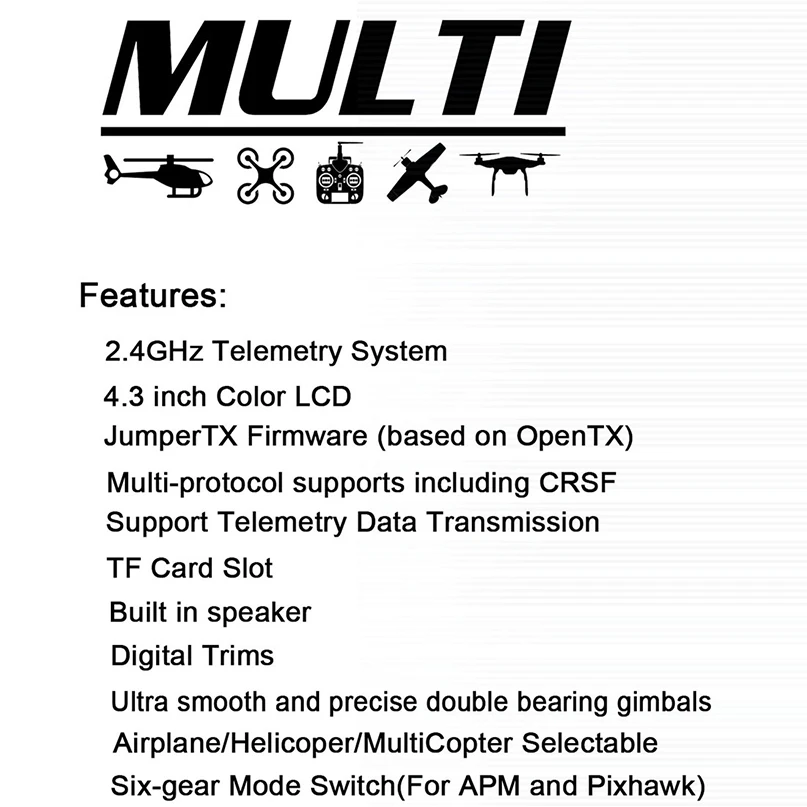 STM32F429BIT6 MCU Промышленный 4,3 дюймов 480*272 открытый читаемый цветной экран Совместимость с прошивкой JumperTX и OpenTX Колесо Кнопка меню Угловой регулируемый ультра-Гладкий двойной подшипник gimbals Мультипротокол передатчика модуль с поддержкой TBS CRSF Съемный аккумулятор Поддерживает телеметрии Память 16 м (может быть расширена tf-картой) Функция голосовой связи Вибрации функция уведомления о сообщениях Стандартный модуль JR 6-режим полета кнопок (для APM и Контроллер полета Pixhawk контроллеров полета) Двухцветный СВЕТОДИОДНЫЙ индикатор состояния