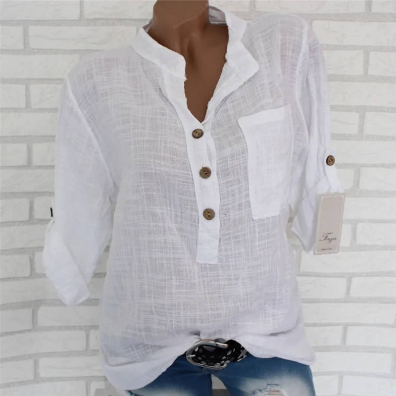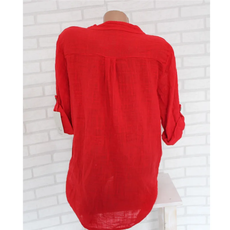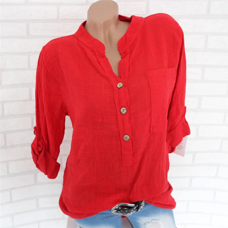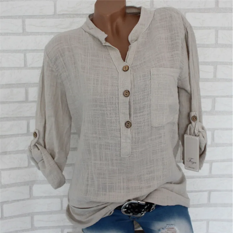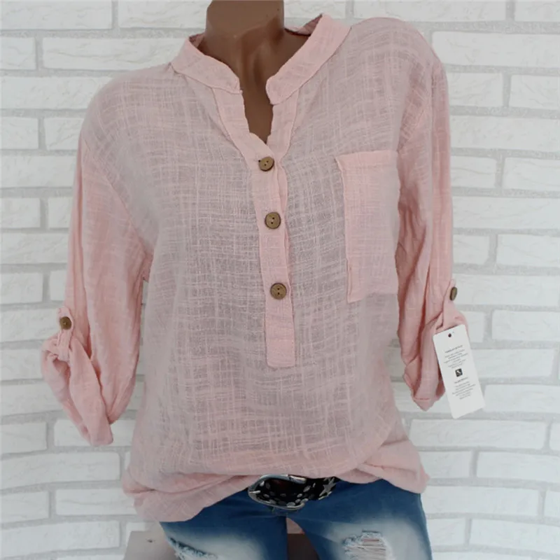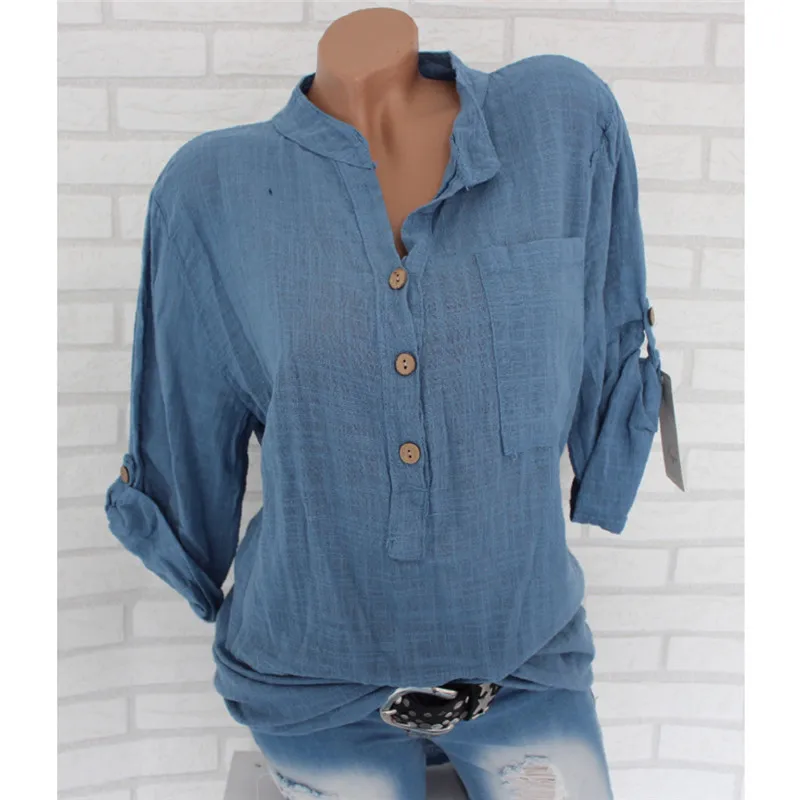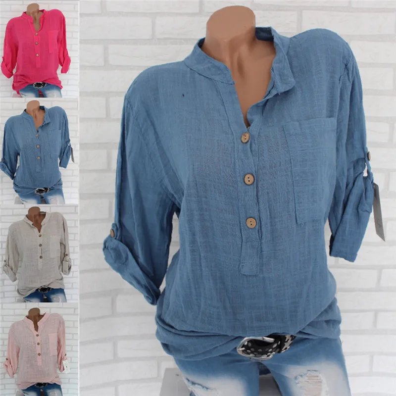 Женская туника с длинным рукавом размера плюс, свободная блузка рубашка с v-образным вырезом и карманами на пуговицах, 2019