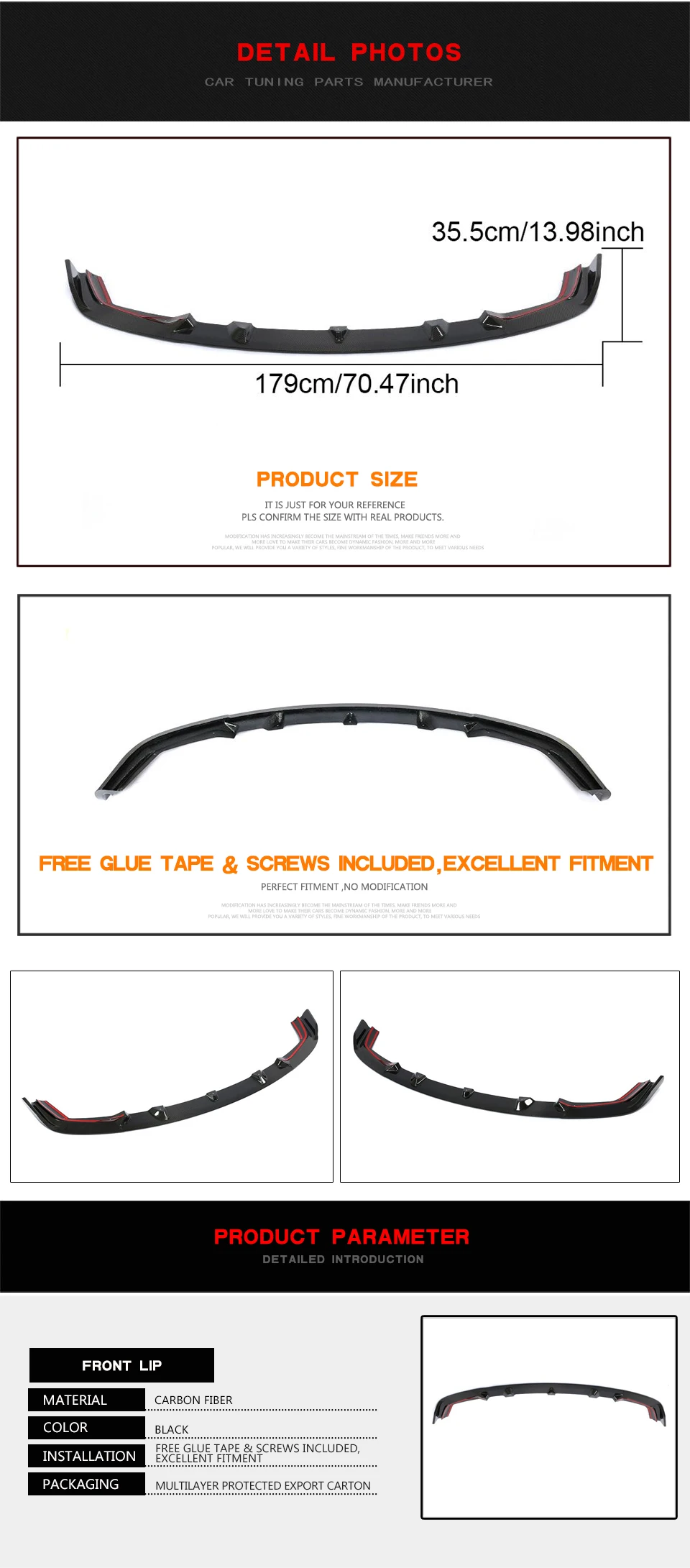 Особенности: -Прочный и длительный срок службы. Характеристики: Материал: углеродное волокно/FRP/кованый углерод. Посылка включает в себя: 1 x передняя губа, клейкая лента, винты.