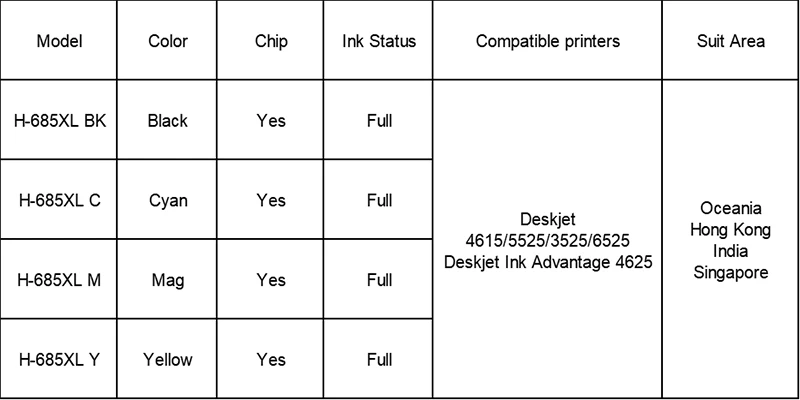 Для HP685 совместимый картридж с чернилами посылка включает в себя :( 1BK + 1C + 1 м + 1Y) Цельнокроеное платье 670XL BK Цельнокроеное платье 670XL C Цельнокроеное платье 670XL м Цельнокроеное платье 670XL Y Примите к сведению, что Совместимая модель принтера только для справки. Пожалуйста, убедитесь, что наша модель соответствует вашей оригинальной модели картриджа. Если есть какие-либо дополнительные вопросы, пожалуйста, не стесняйтесь связаться с нами.