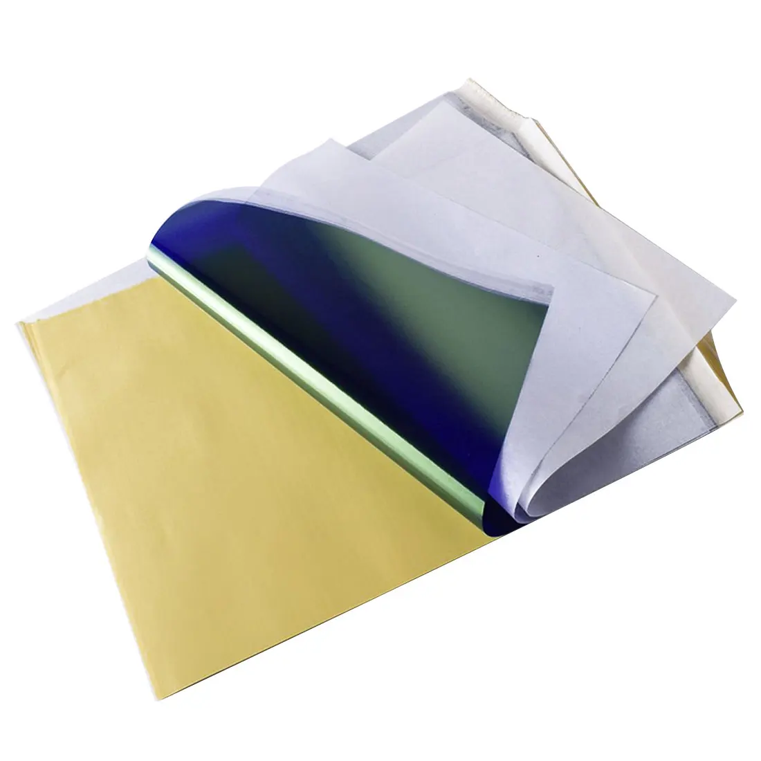 2. Слойные бумаги-трафаретная бумага для татуировок 4 слоя: первая страница-это белый основной лист, к которому применяется дизайн; Вторая страница-полупрозрачная Защитная ткань, которая должна быть удалена перед использованием; третья страница-темно-синяя углеродная страница; Последняя страница-желтая подложка